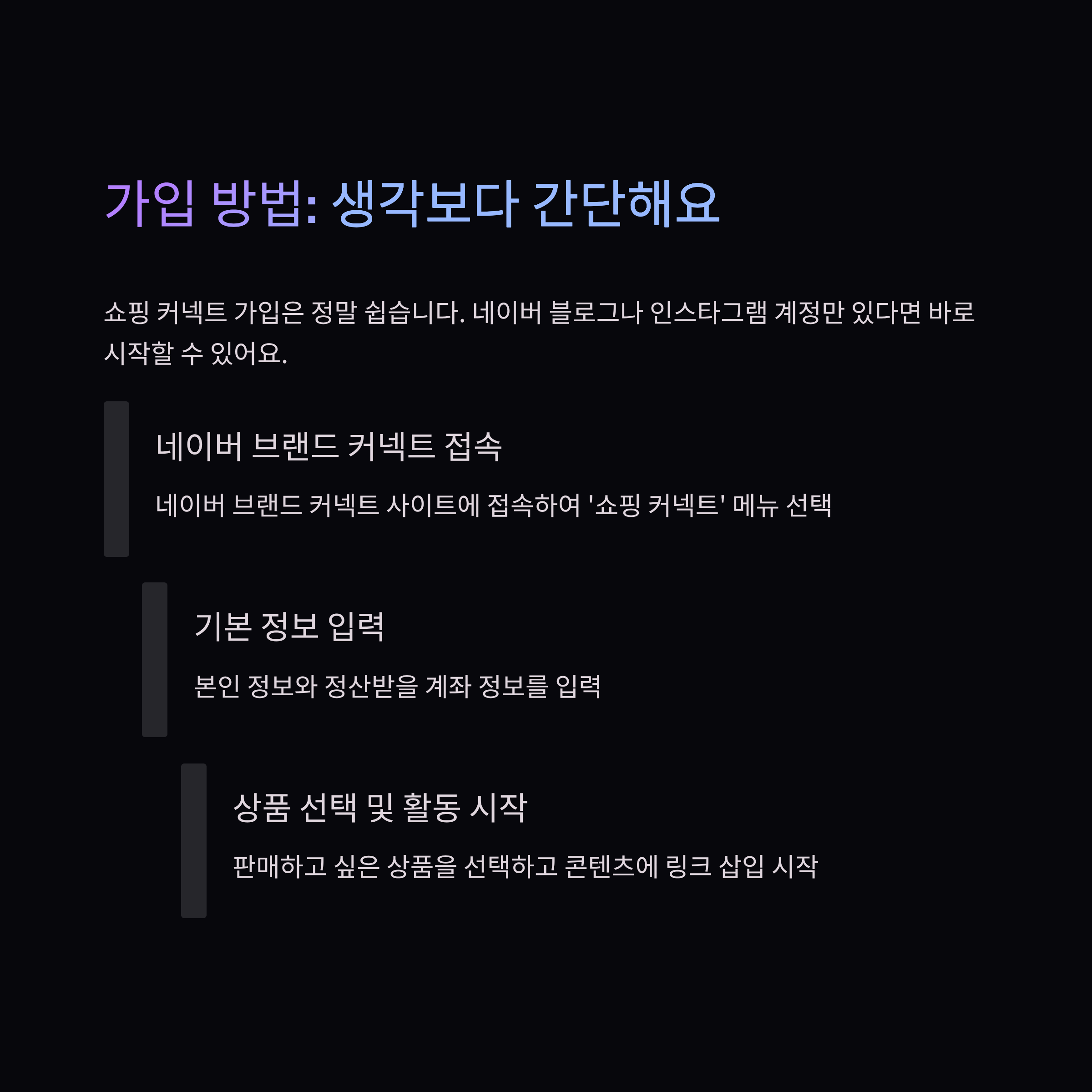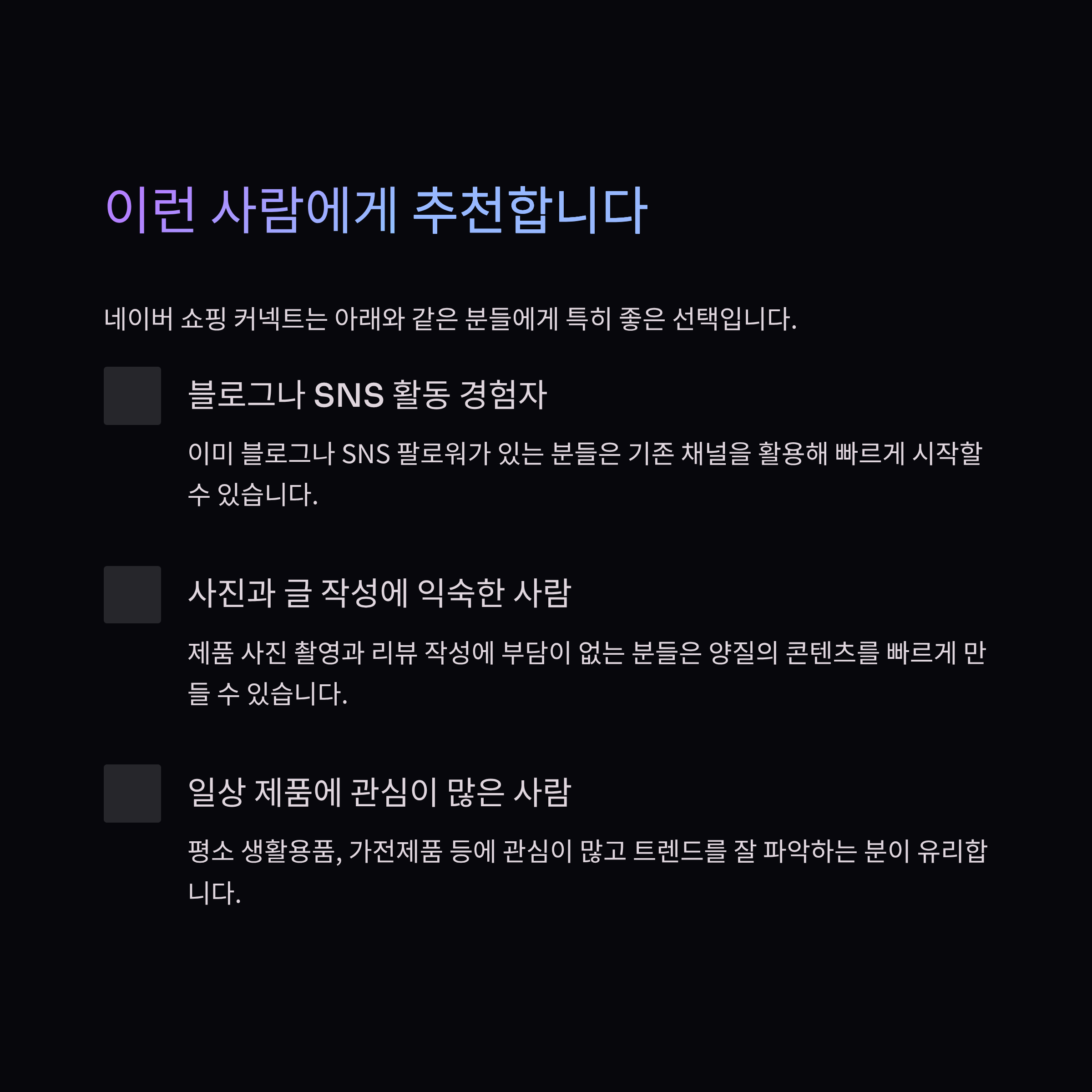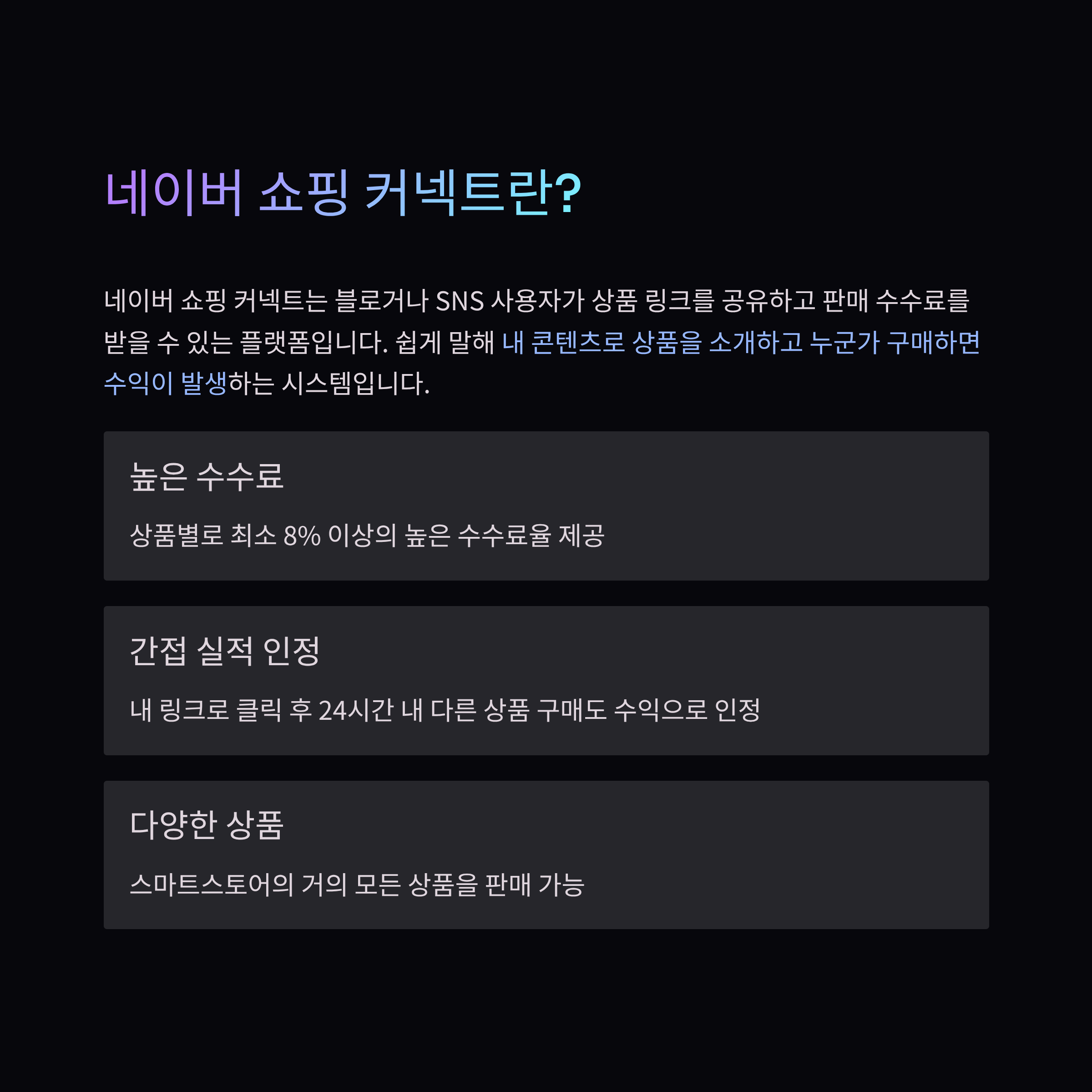 쇼핑 커넥트는 기존에 블로그나 SNS 팔로워가 있거나, 사진·글 작성에 익숙한 사람에게 유리합니다. 반면, 콘텐츠 작성이 어렵거나 하루에 10분 이상 투자하기 힘든 사람은 수익 내기가 어렵습니다.