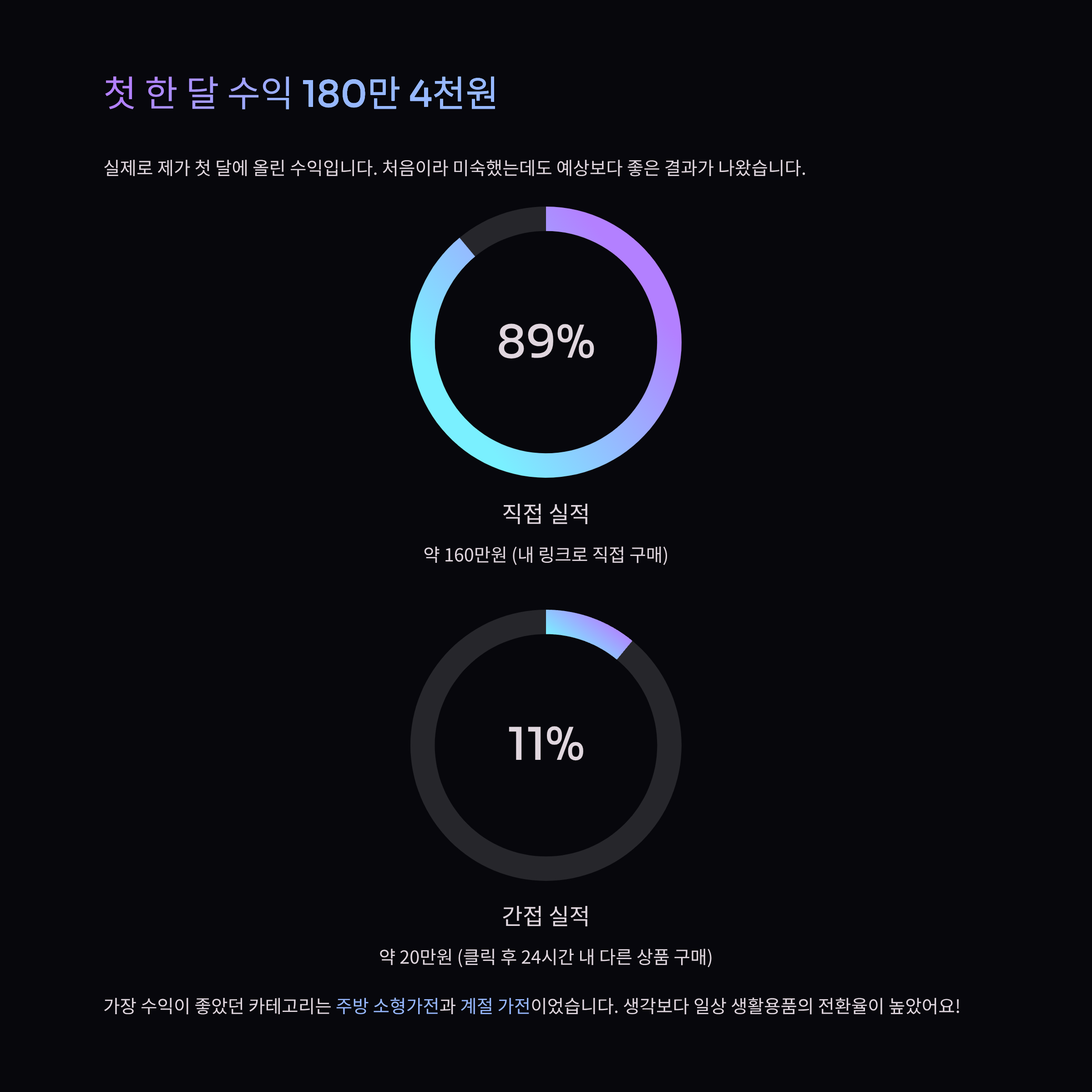 첫 달 수익은 총 180만 4천원, 이 중 직접 실적이 160만원, 간접 실적이 약 20만원이었습니다. 가장 잘 팔린 건 주방 소형가전이었고, 그 다음이 계절 가전이었습니다.