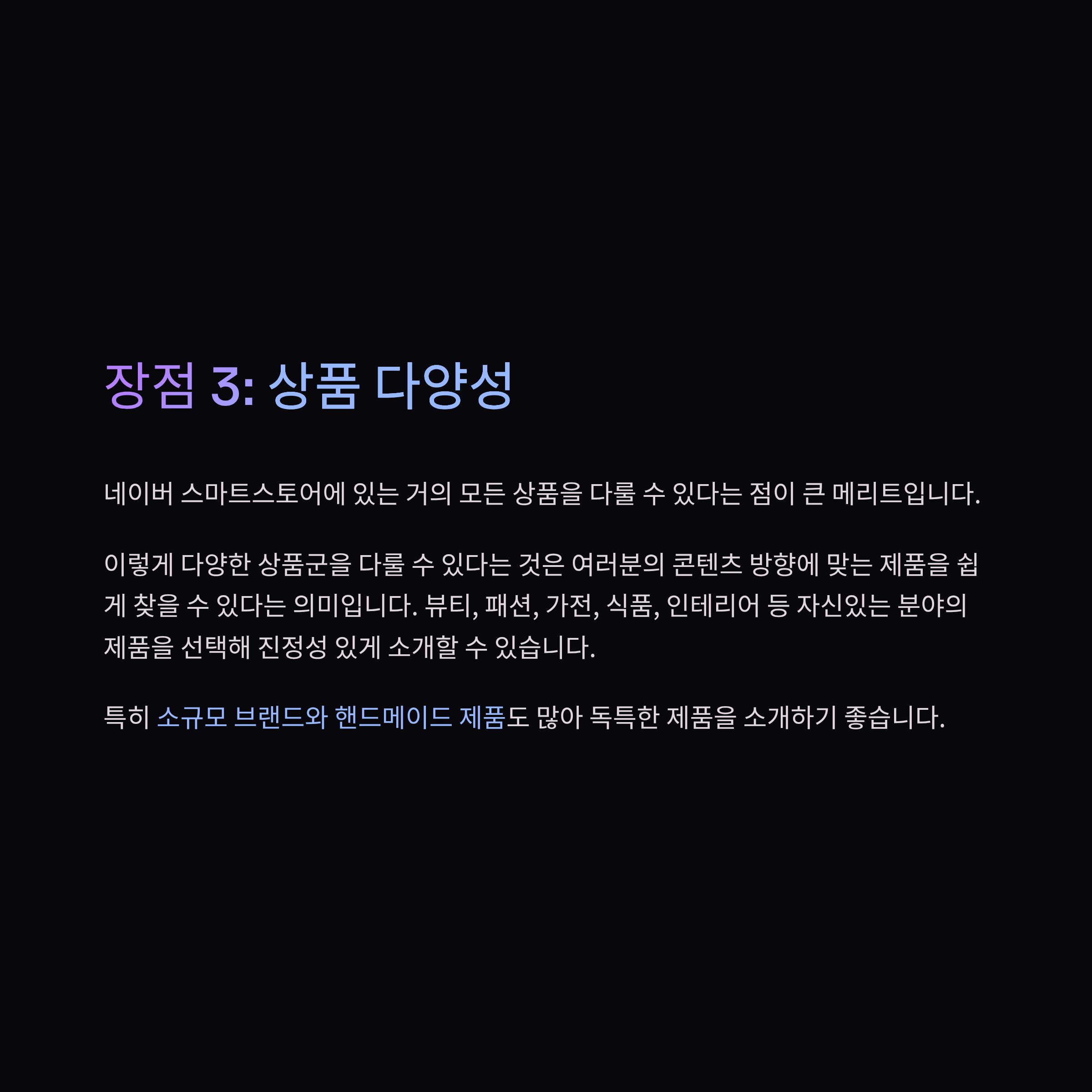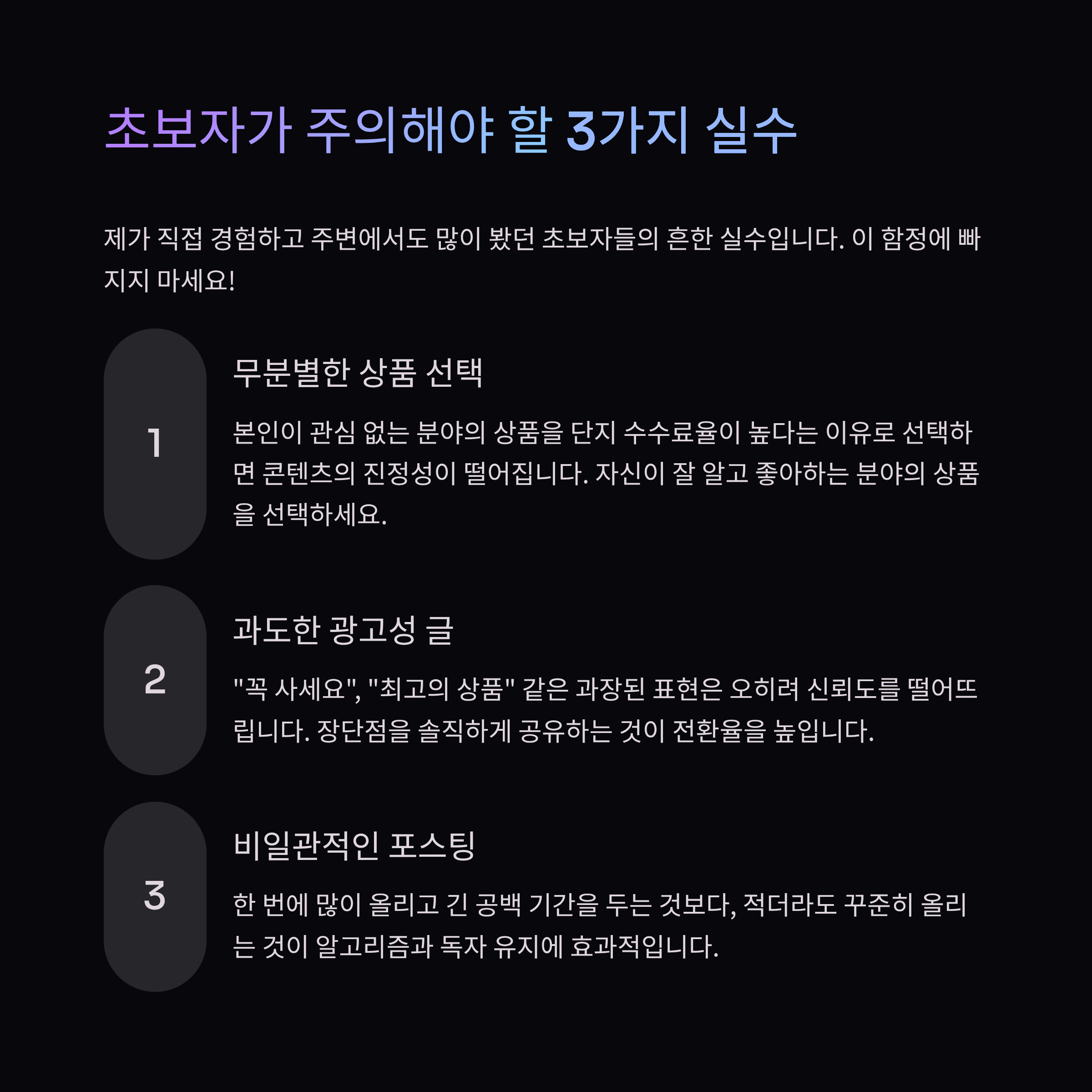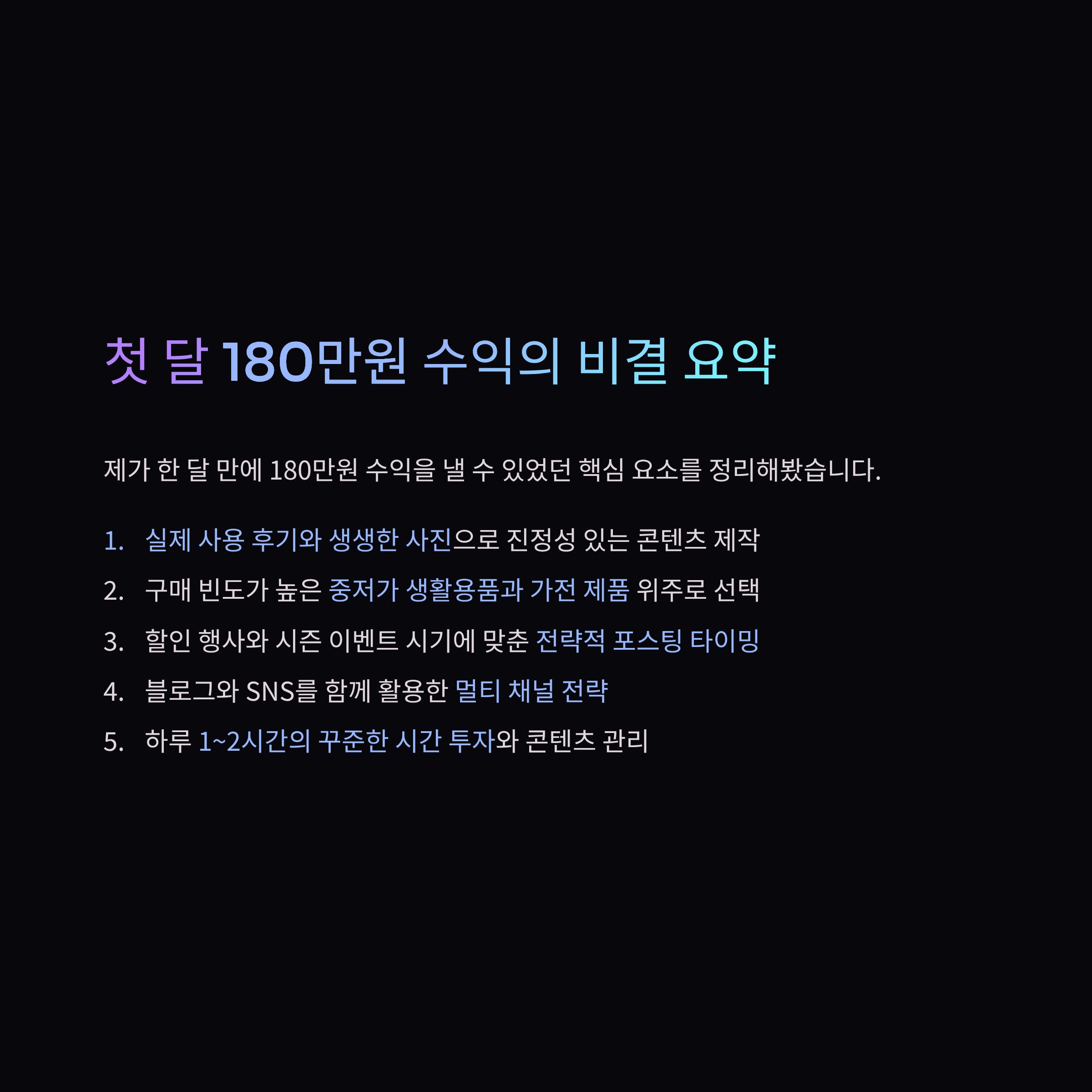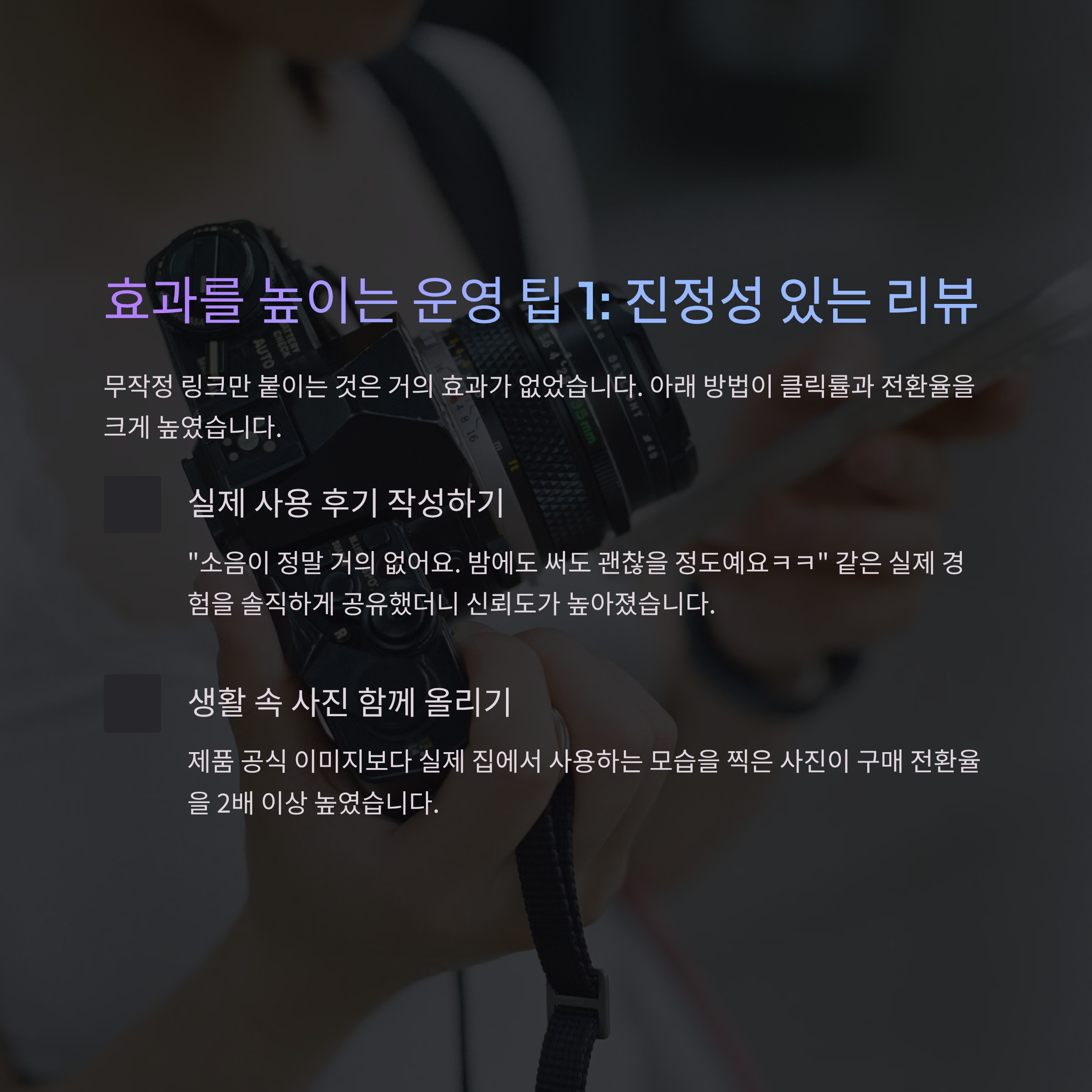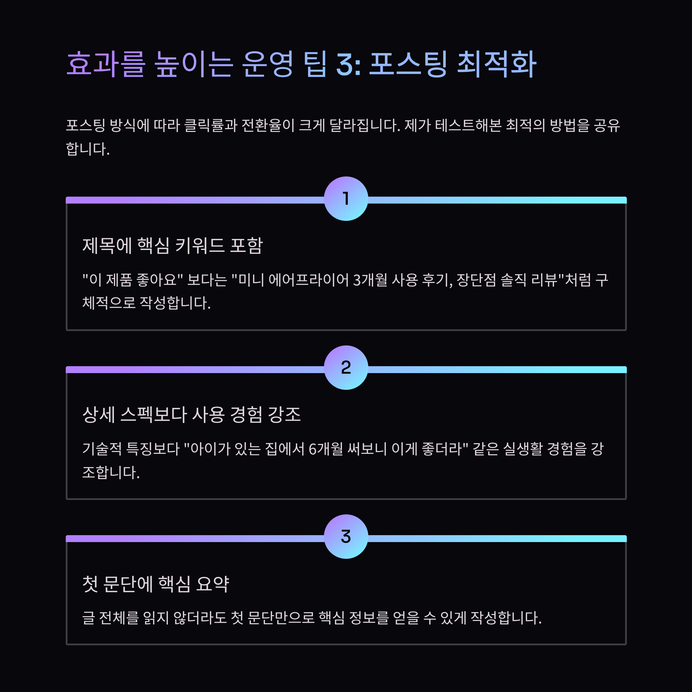 저는 특히 생활 가전 분야에서 반응이 좋았는데, “소음이 정말 거의 없어요. 밤에도 써도 괜찮을 정도예요ㅋㅋ”라는 실제 사용 경험을 함께 쓰면 구매 전환율이 확실히 올라갔습니다.