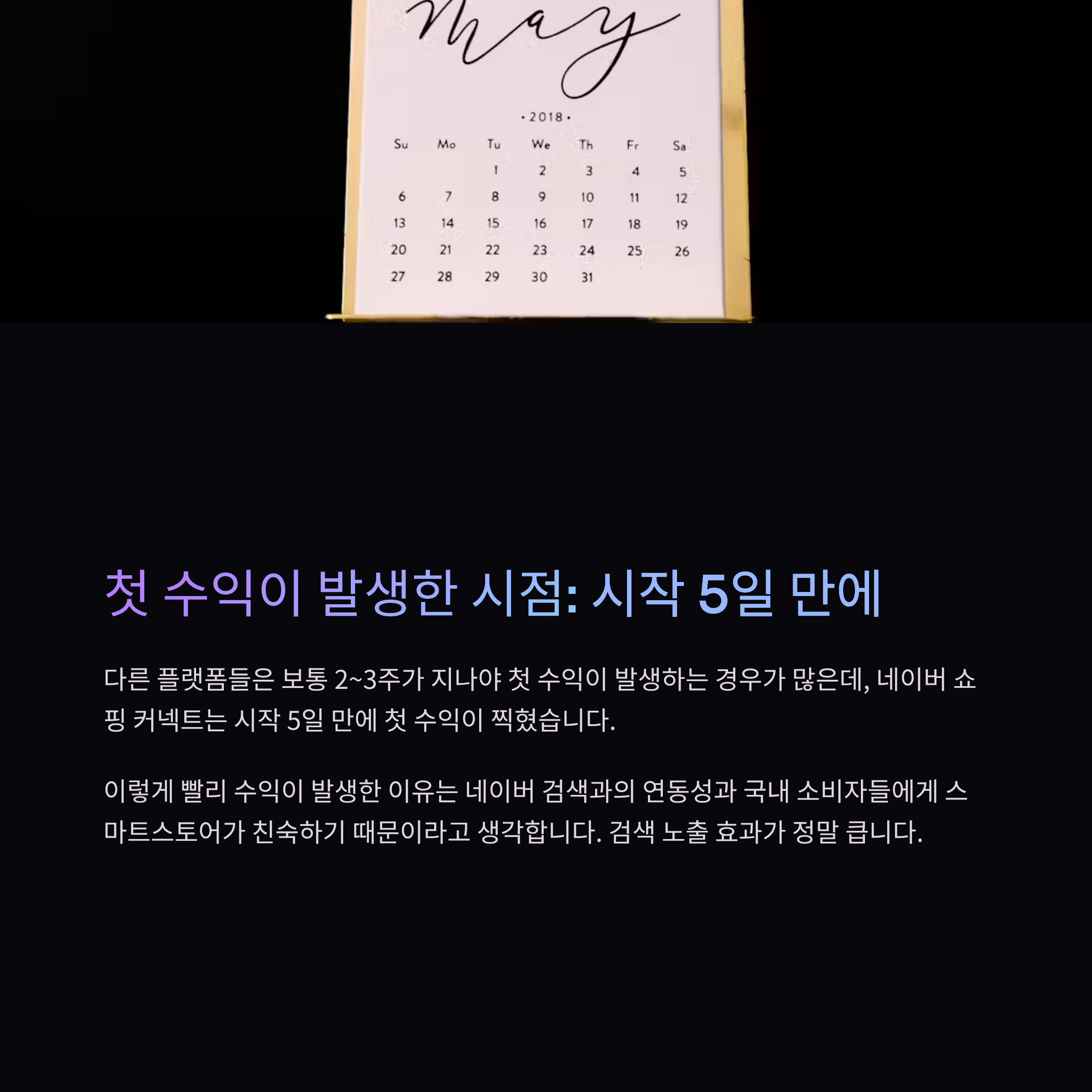 솔직히 다른 플랫폼 대비 수익 속도가 빠른 편이었습니다. 첫 수익은 시작 5일 만에 찍혔습니다. 이유는 네이버 쇼핑 커넥트가 네이버 검색과 연동되어 노출이 잘 되고, 스마트스토어 상품이 국내 사용자들에게 친숙하기 때문입니다.