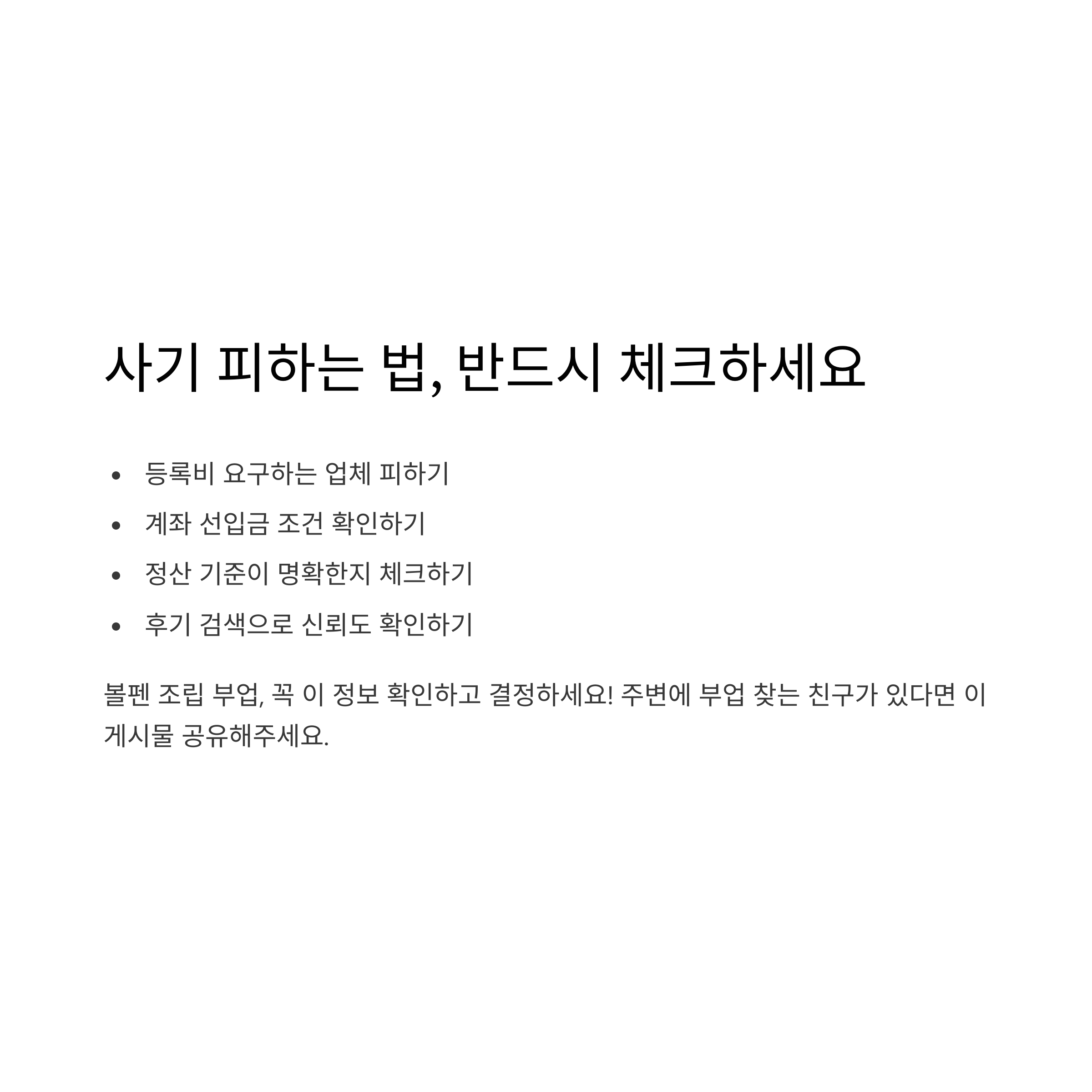제가 이 부업을 하면서 가장 많이 봤던 건, ‘등록비 요구’와 ‘계좌 선입금’입니다. 이 두 가지가 들어간다면 무조건 다시 한 번 생각해 보셔야 합니다.