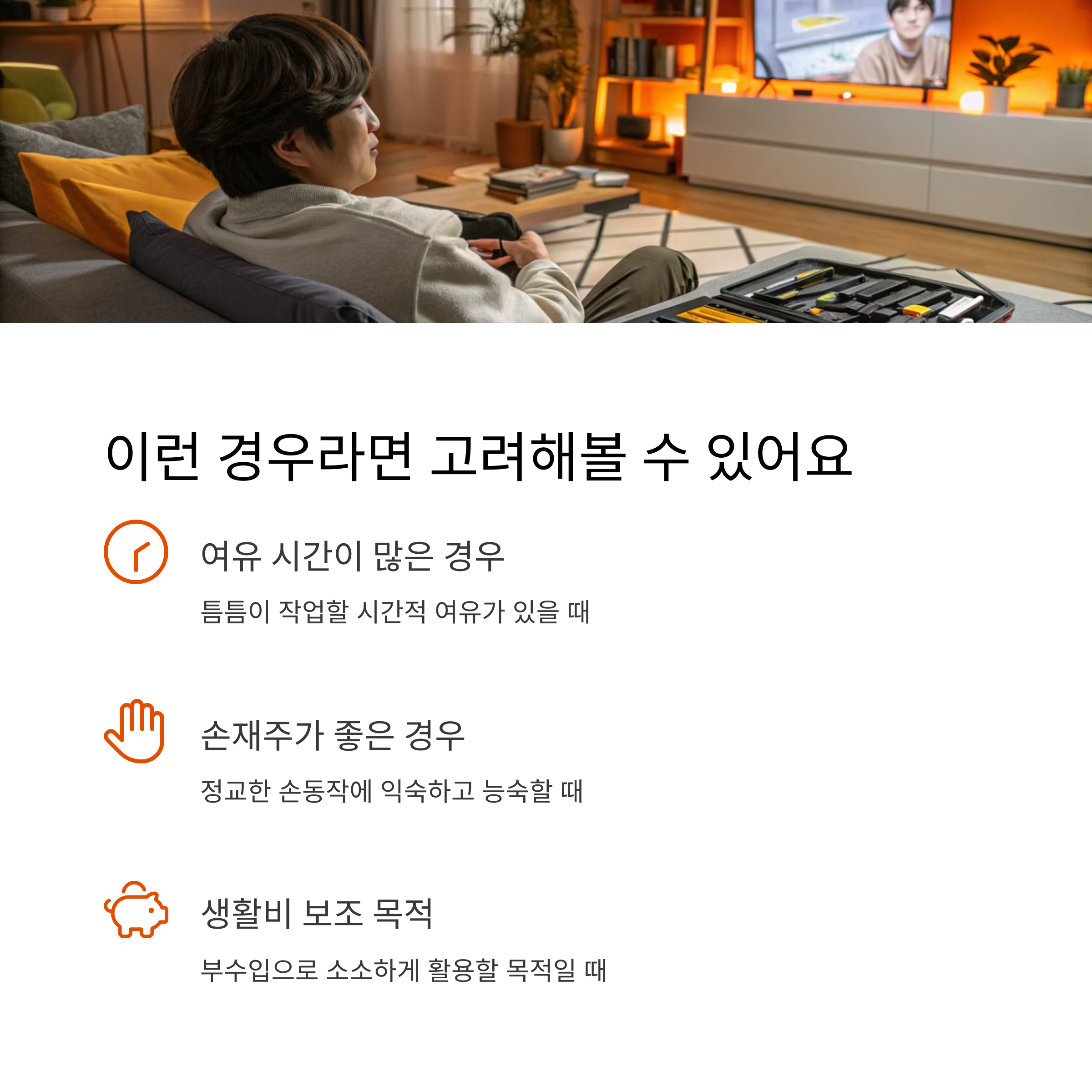 시간이 정말 많고, 단순한 일이라도 꾸준히 할 수 있다면, 아주 소소하게 수익을 낼 수는 있어요. 특히 손재주가 있거나, 정리정돈을 잘하는 사람은 작업 효율이 훨씬 높습니다.