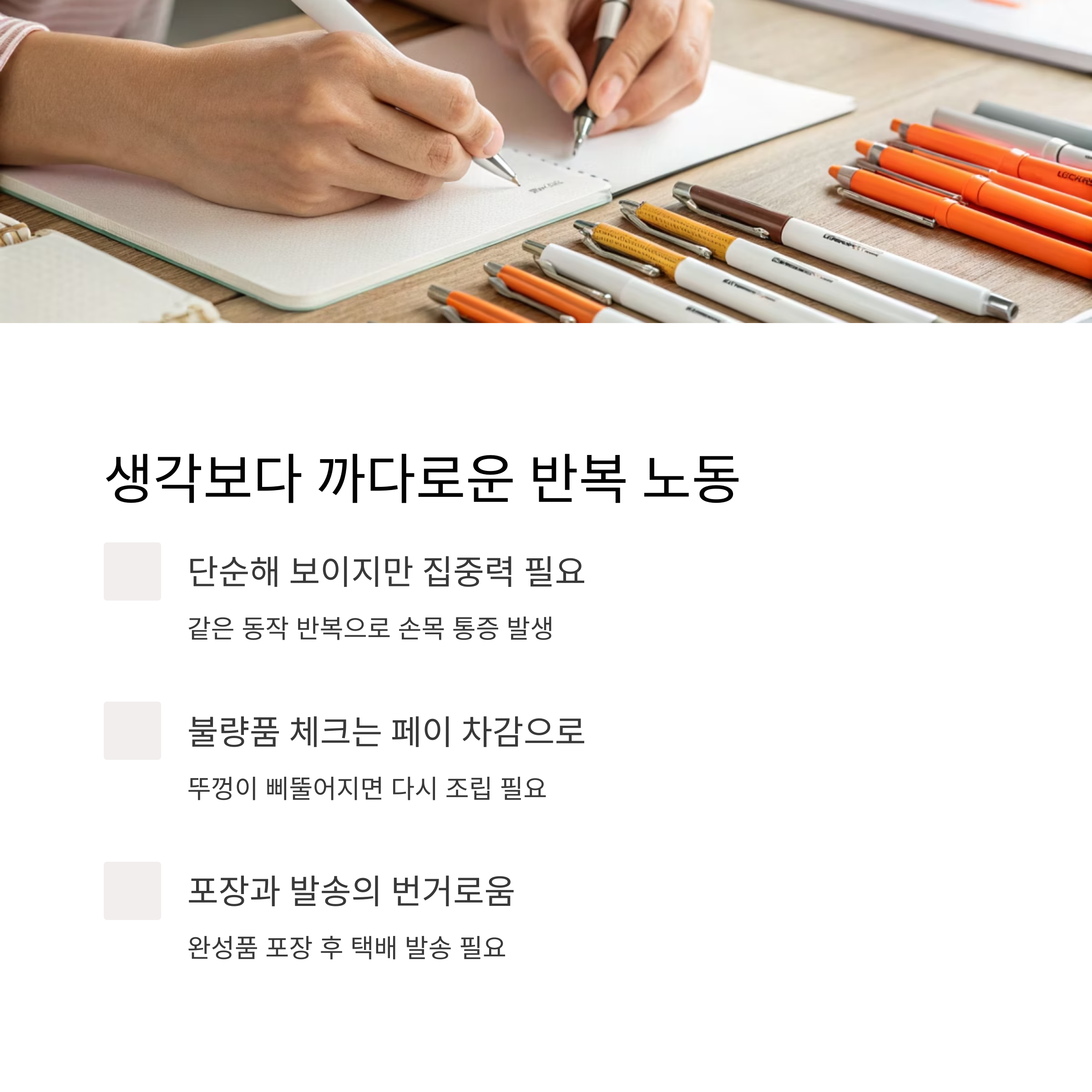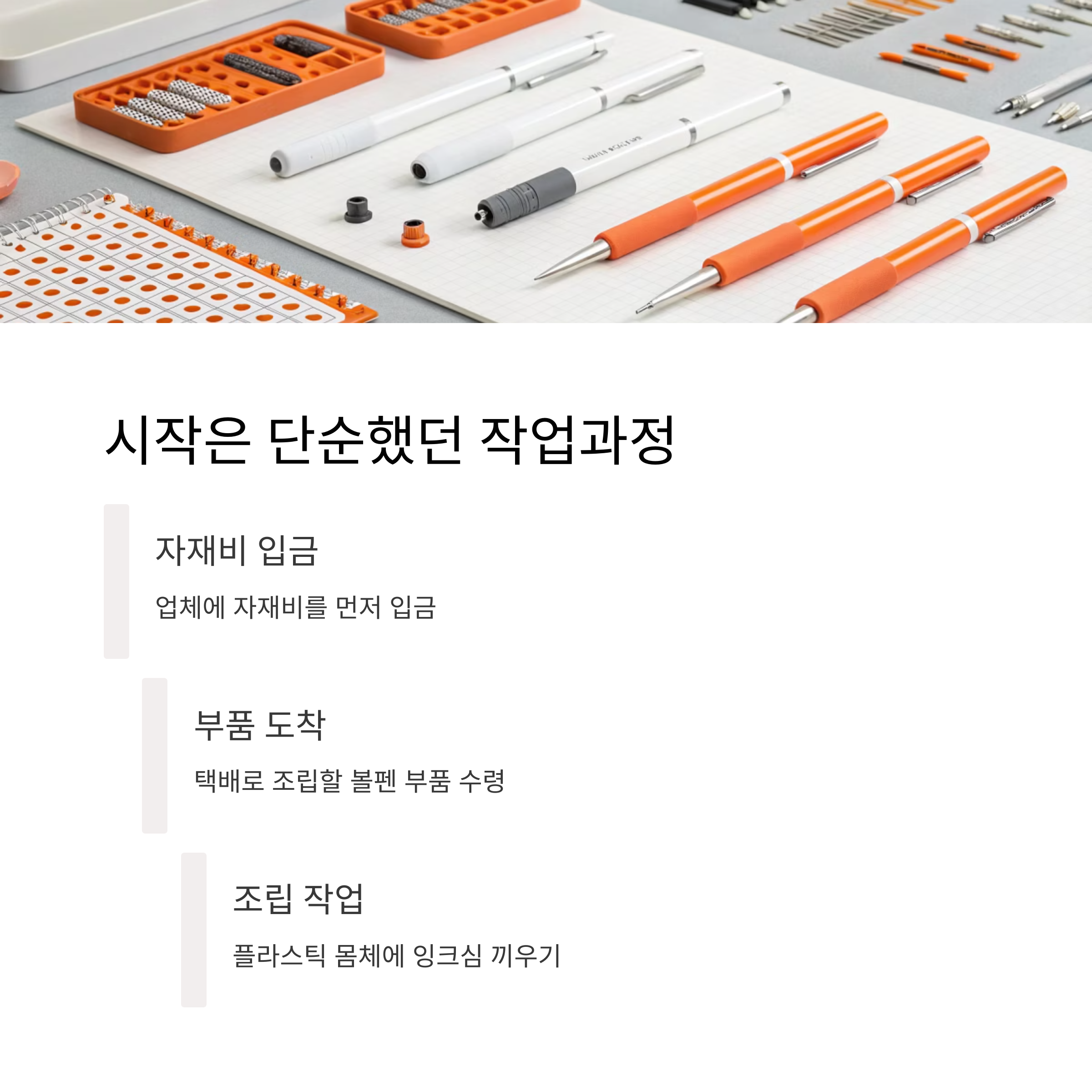 처음 신청할 때는 ‘자재비’를 미리 입금해야 했어요. 택배로 볼펜 부품들이 도착하고, 그걸 조립해서 다시 돌려보내는 방식이었죠. 사실 이때까지는 “뭐, 이런 식으로 돌아가는 거겠지” 싶었고, 포장도 나름 정갈하게 왔길래 안심했어요.