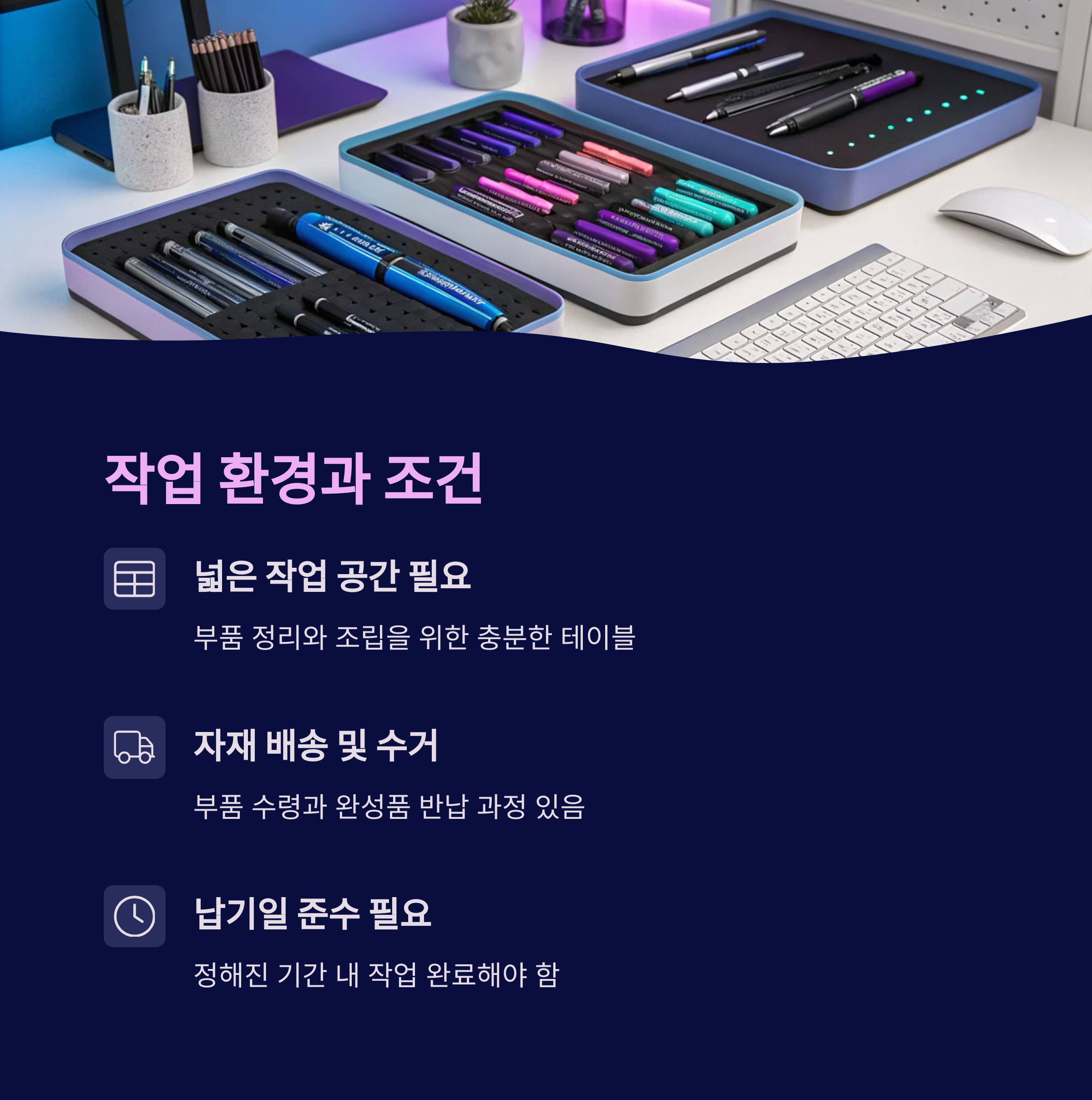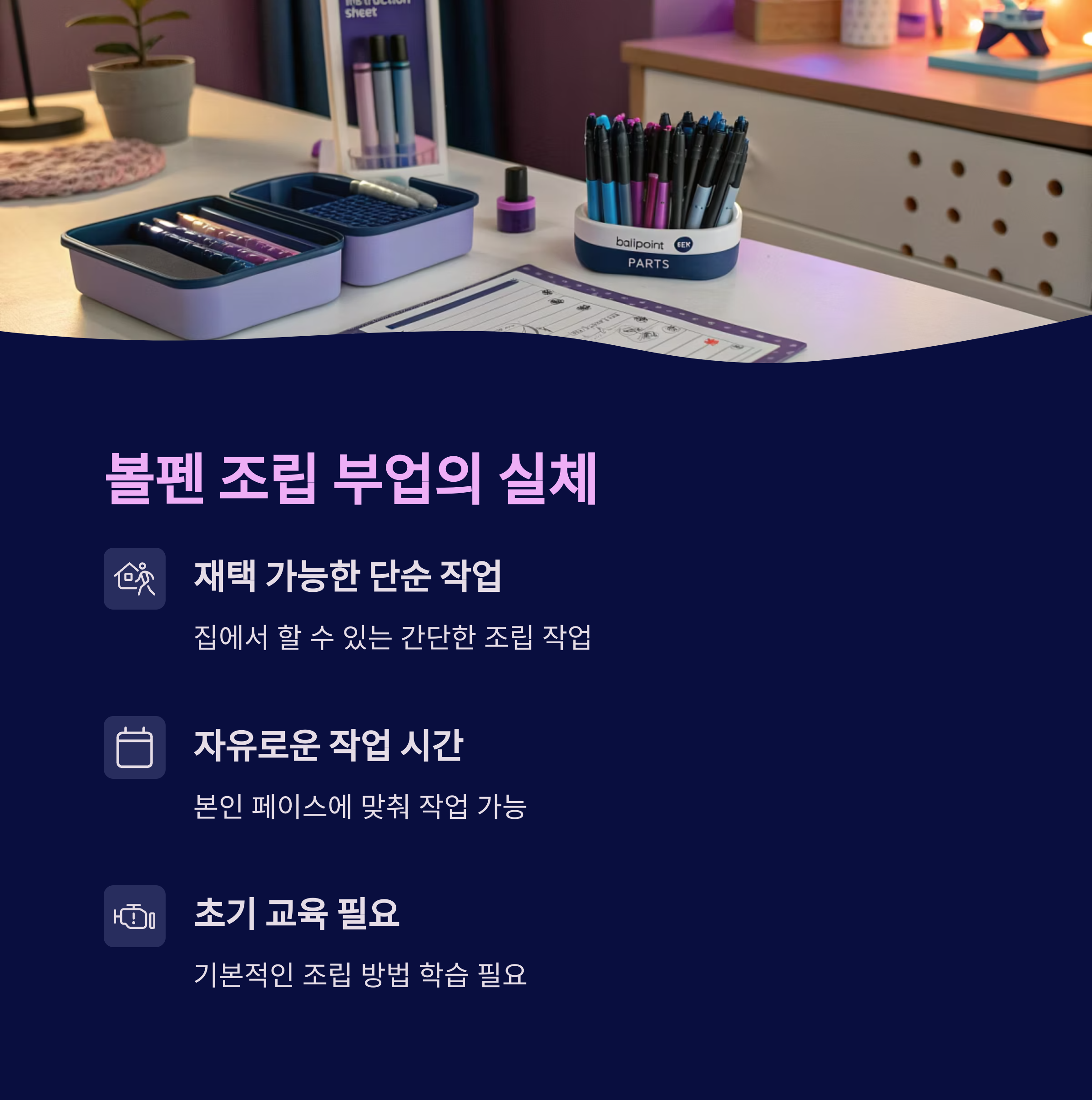 볼펜 조립 부업은 대부분 재택근무 형태로 진행됩니다. 업체에서 부품을 보내주면, 이를 조립하여 다시 보내는 방식입니다. 작업은 단순하지만 반복적이며, 손목이나 눈에 피로가 쌓일 수 있습니다. 또한, 일부 업체에서는 제품 불량률에 따라 수익을 차감하는 경우도 있어, 꼼꼼한 작업이 요구됩니다.