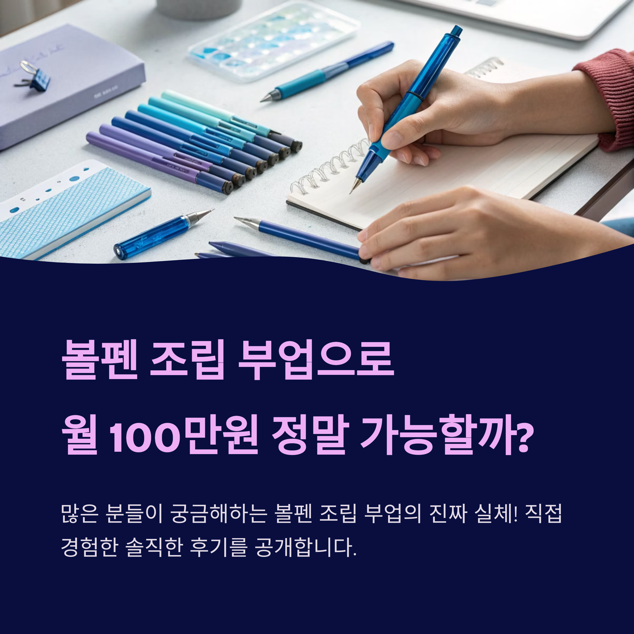 볼펜 조립 부업, 정말로 월 100만원 벌 수 있을까요? 실제로 해본 사람들의 경험담을 통해 그 진실을 파헤쳐보겠습니다. 이 글에서는 볼펜 조립 부업의 실제 수익, 작업 환경, 그리고 주의해야 할 점들을 상세히 소개합니다. 과연 이 부업이 여러분에게 적합한 선택일지 함께 알아보시죠.