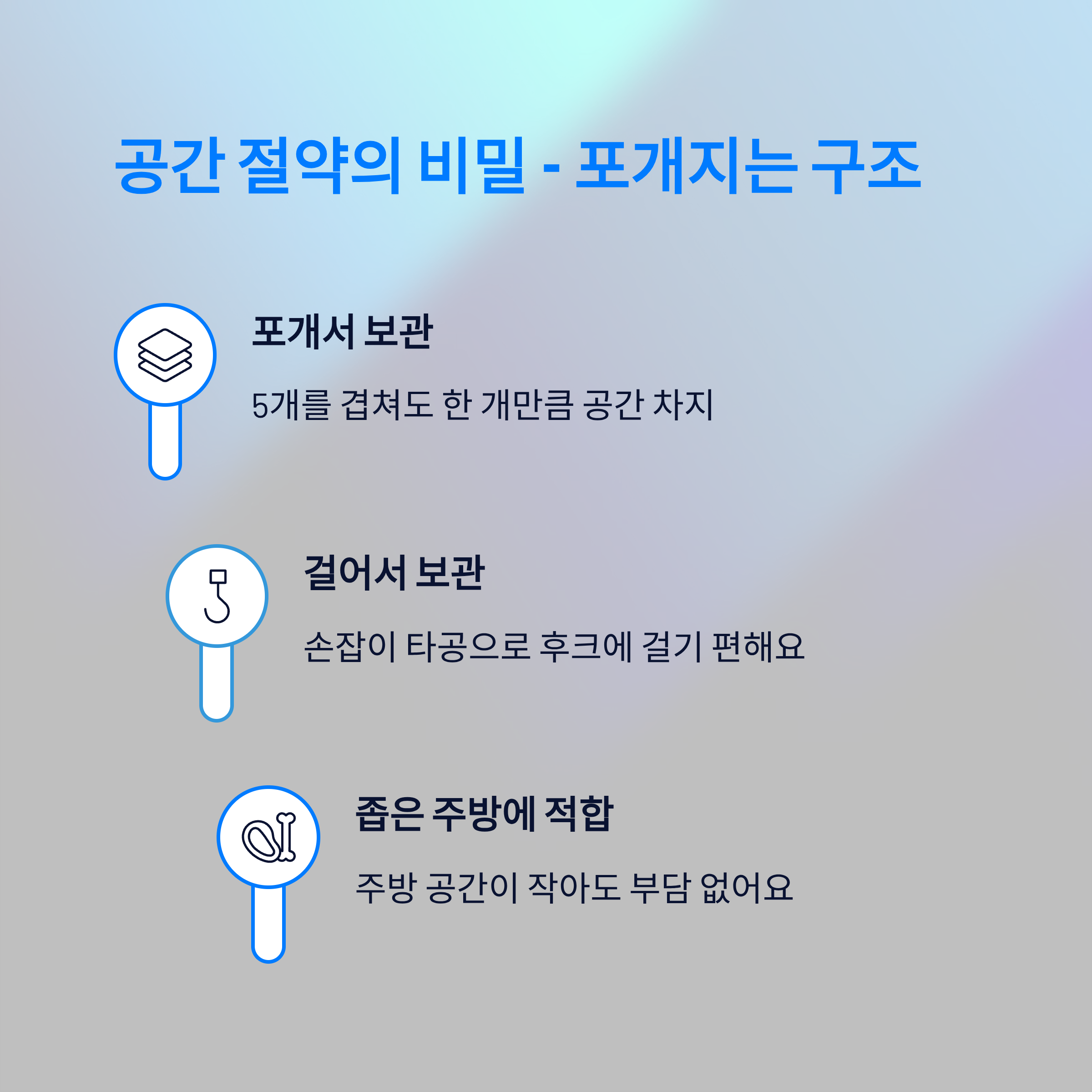 특히, 저는 주방 후크에 걸어 두는데, 꺼내 쓸 때도 바로바로 확인되니 훨씬 편하더라고요. 작은 차이지만 주방 동선에서 꽤 큰 만족감을 줬습니다.