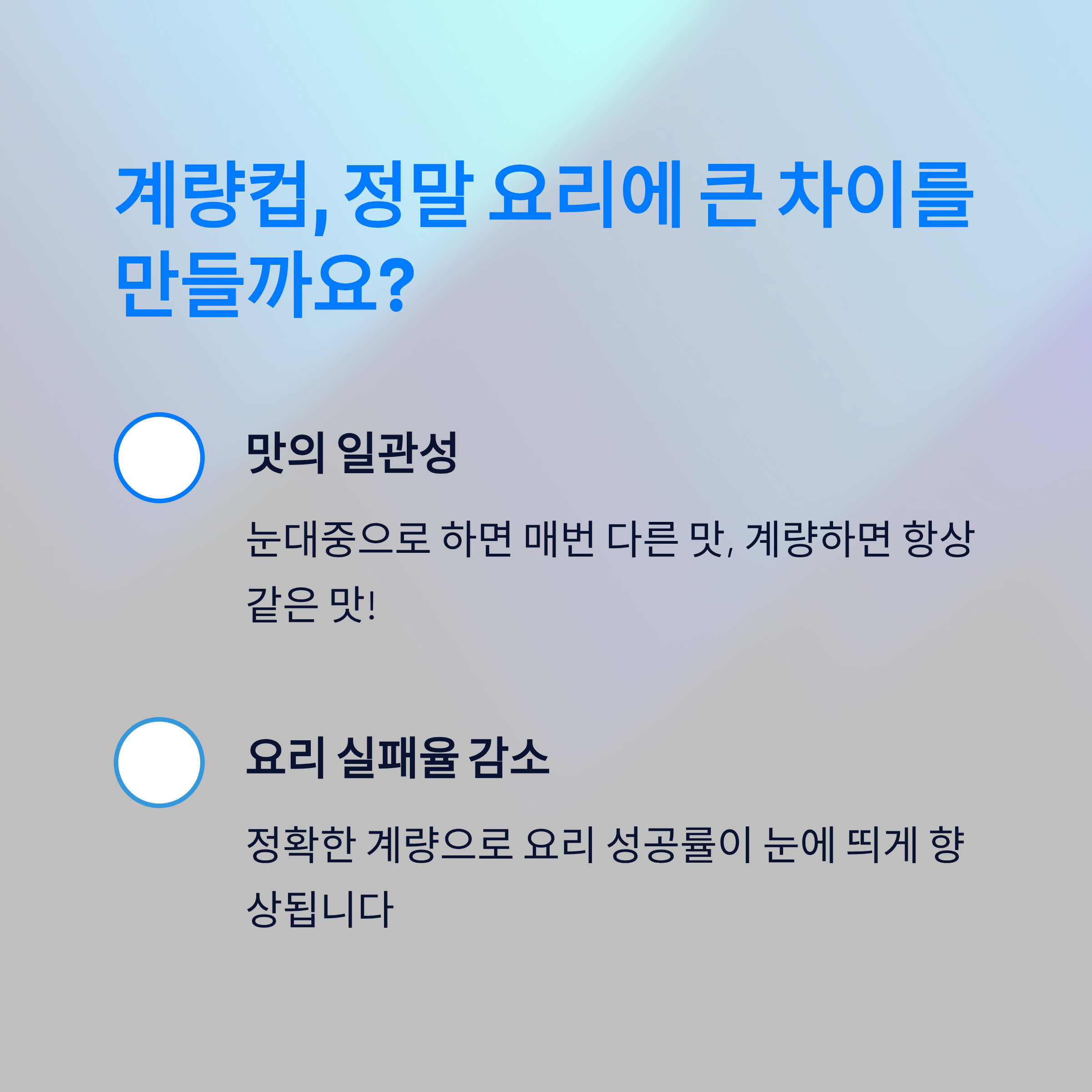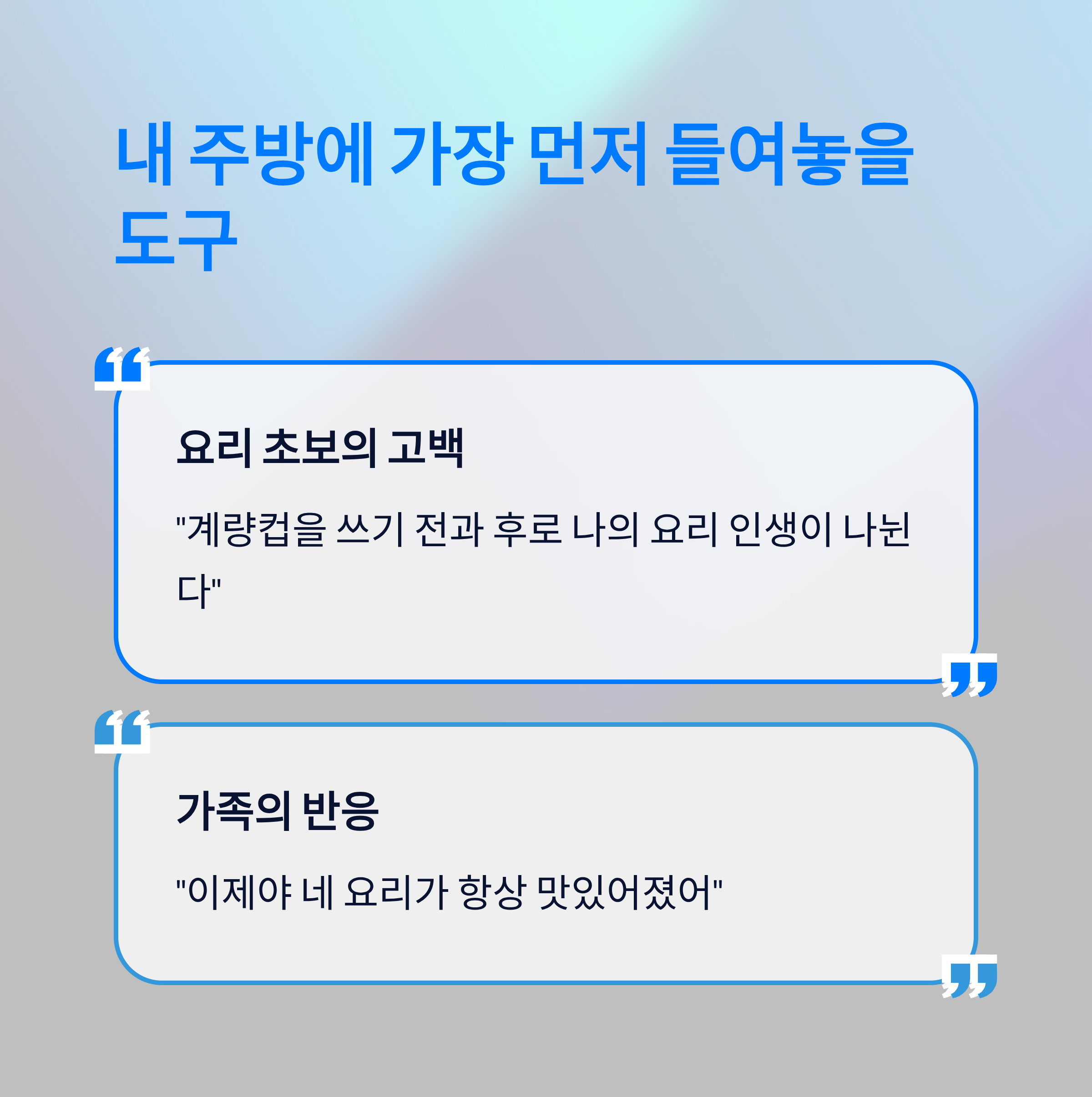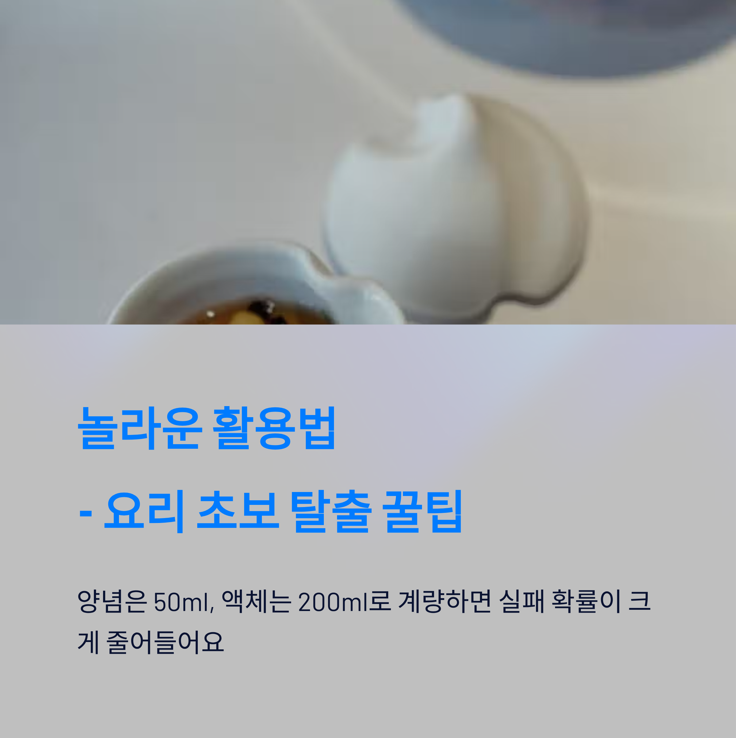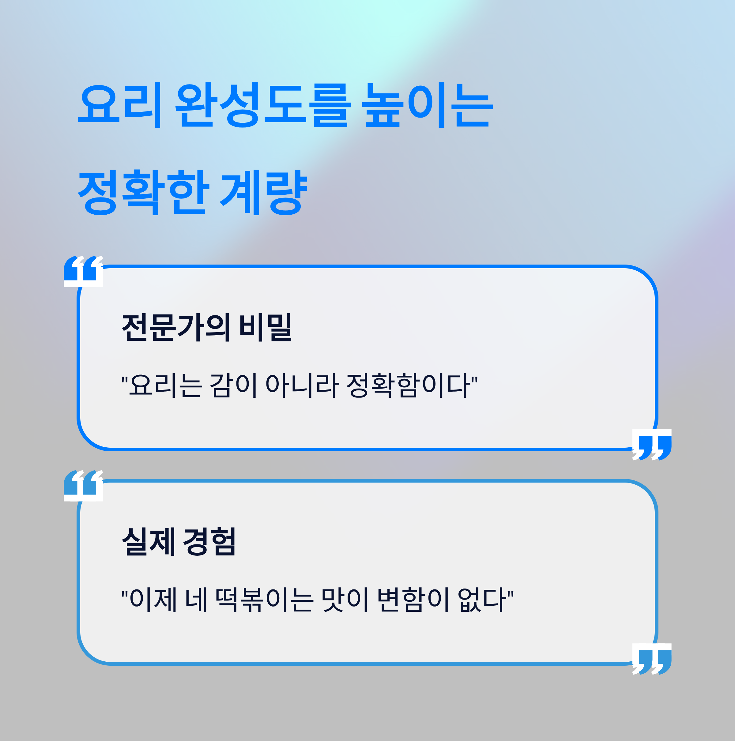 솔직히 말하면 예전엔 ‘요리는 감이다’라고 생각했어요ㅋㅋ 그런데 정확히 계량해보니까, 요리 맛이 일정하게 나와서 오히려 스트레스가 줄었어요. 특히 손님 초대했을 때 맛이 안정적이니 자신 있게 요리를 낼 수 있었죠.