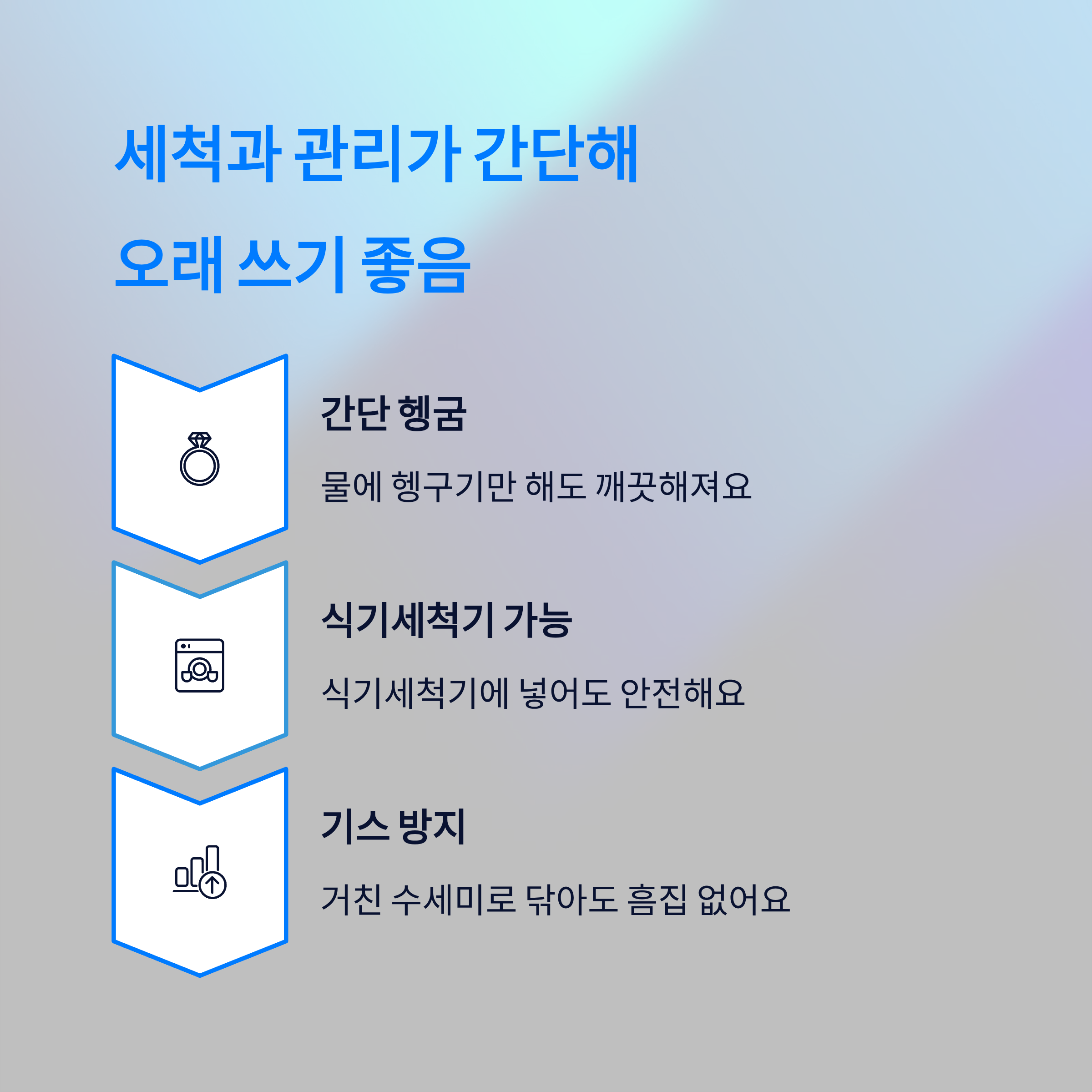 식기세척기에 넣어도 문제없이 사용 가능해서 자취생이나 맞벌이 부부한테 특히 잘 맞을 것 같아요. 위생적인 관리가 가능하다 보니, 장기간 써도 새것 같은 느낌을 유지할 수 있었습니다.