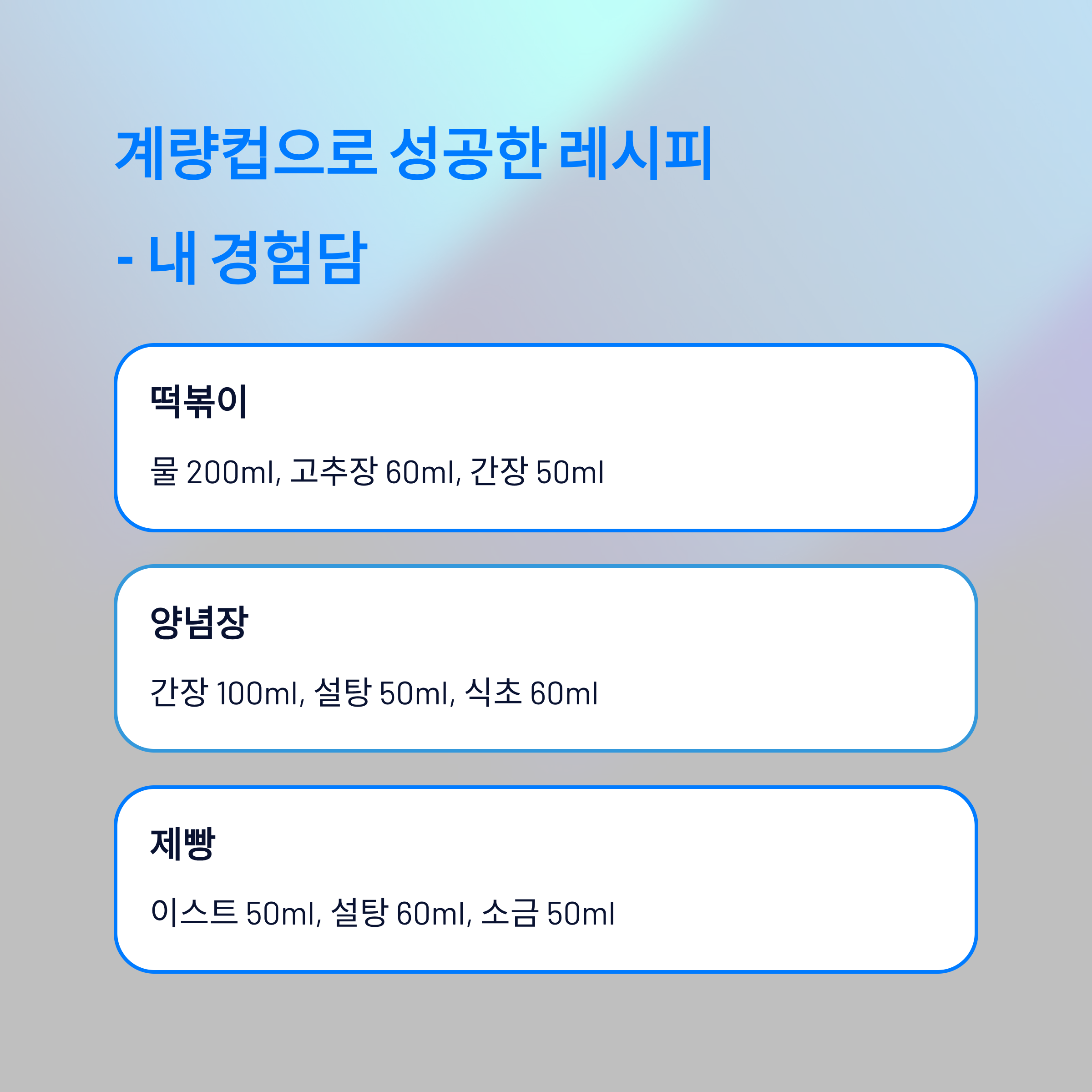저는 떡볶이 할 때 계량컵을 활용하는데, 물·고추장·간장 비율이 일정해지면서 매번 맛이 동일하게 나와서 가족들 반응이 좋아졌습니다. "이제 네 떡볶이는 맛이 변함이 없다"라는 얘기를 들었을 때 정말 뿌듯했어요.