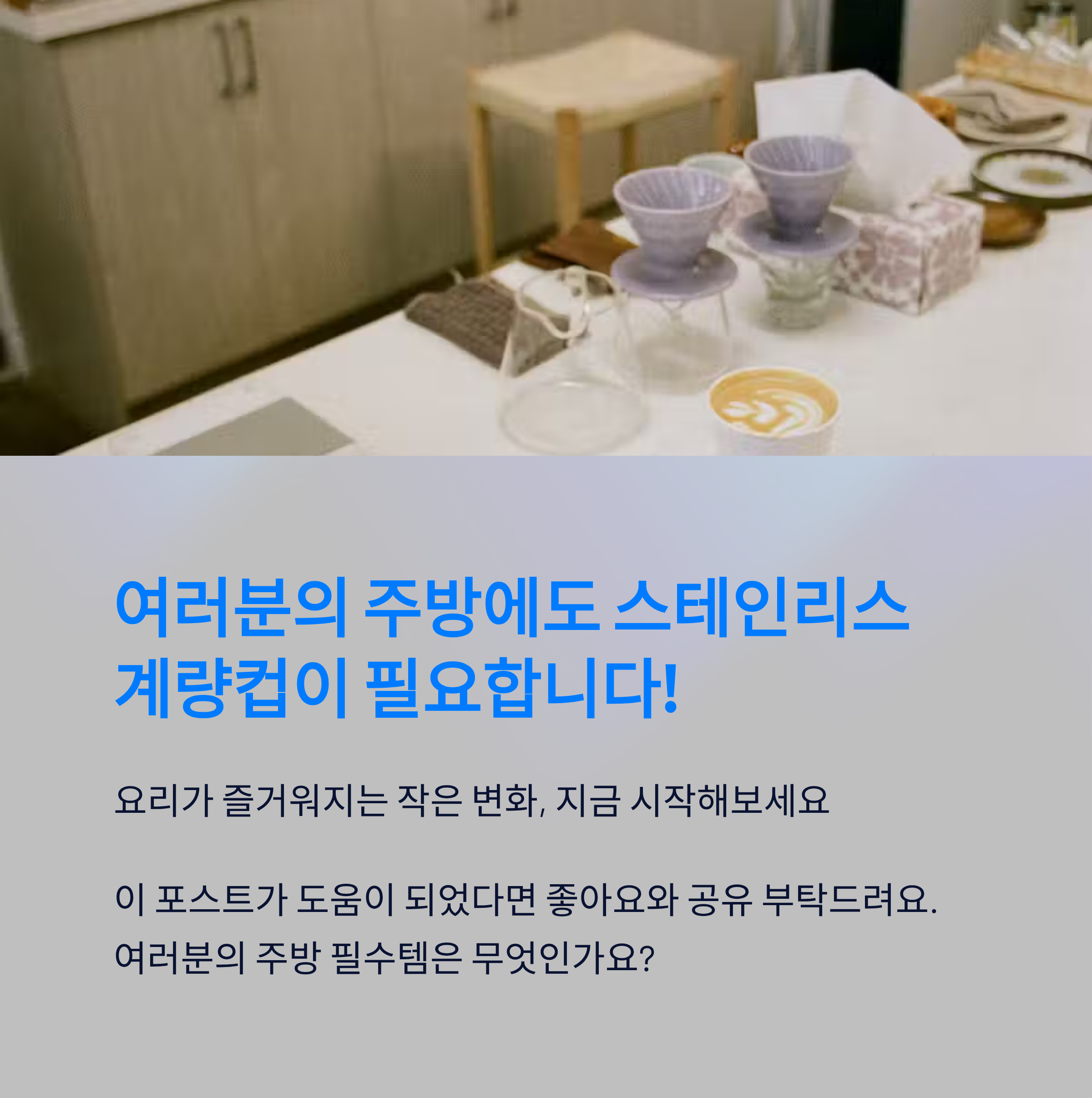그리고 뜨거운 재료를 계량할 때도 변형 걱정이 없다는 점이 좋았어요. 저는 종종 육수 끓이다가 바로 계량컵에 담는데, 플라스틱은 뜨거워서 불안했거든요. 스테인리스는 그 부분에서 확실히 안전했습니다. 제발, 싸다고 아무거나 쓰지 마세요. 내가 먹고, 우리 아이가 먹고, 우리 가족이 먹는 거잖아요. 요리장비는 요리하는 사람의 자존심이예요.