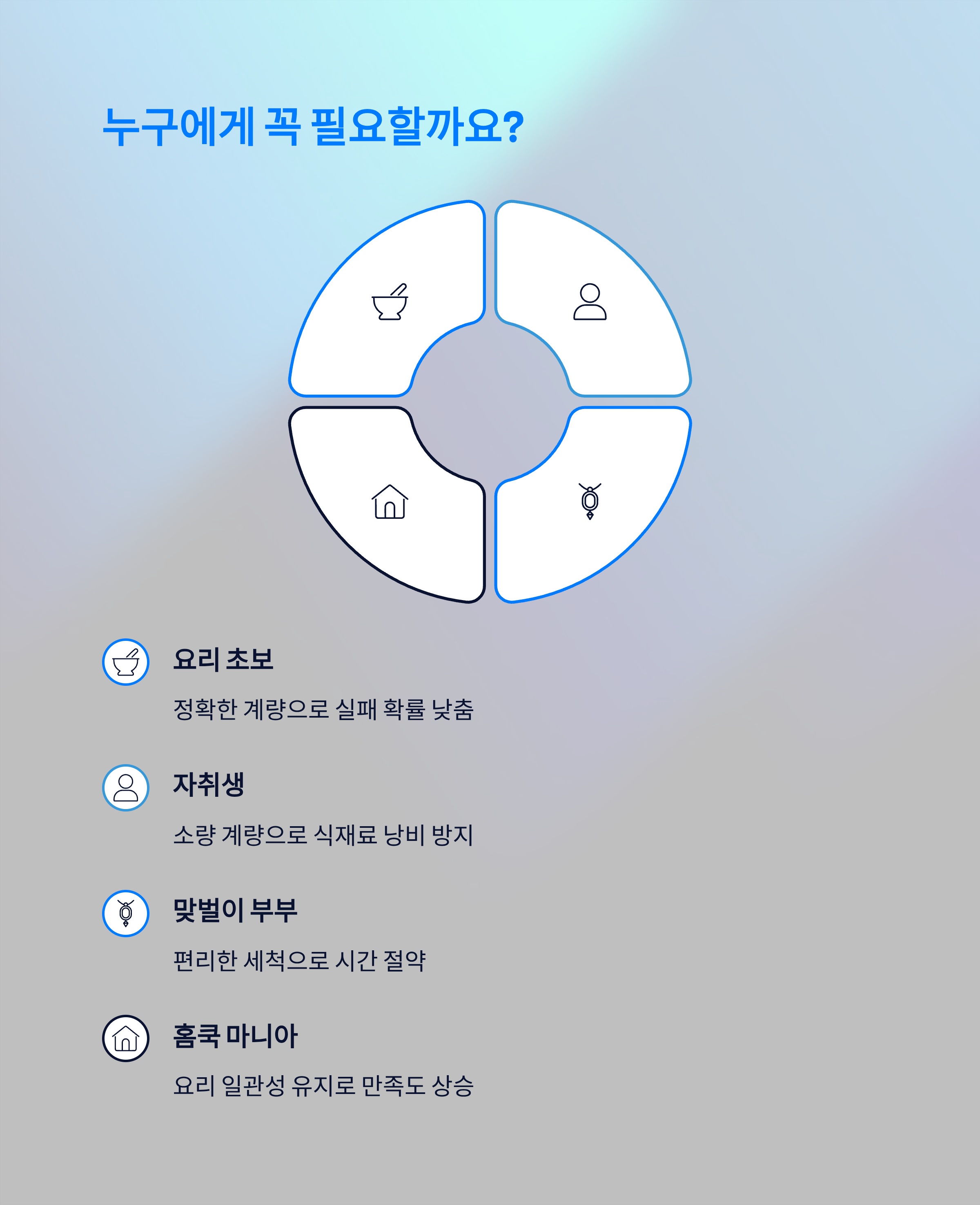요리에 자신 없는 초보부터, 집에서 자주 요리하는 분들까지 모두에게 도움이 되지만 특히 자취생에게 강력 추천해요. 소량 계량이 가능해서 혼자 요리할 때 낭비가 줄고, 세척도 간단하니까 매일 써도 불편하지 않거든요. 반대로 ‘요리 거의 안 하고 배달 위주’인 분들에게는 크게 필요 없을 수도 있어요.