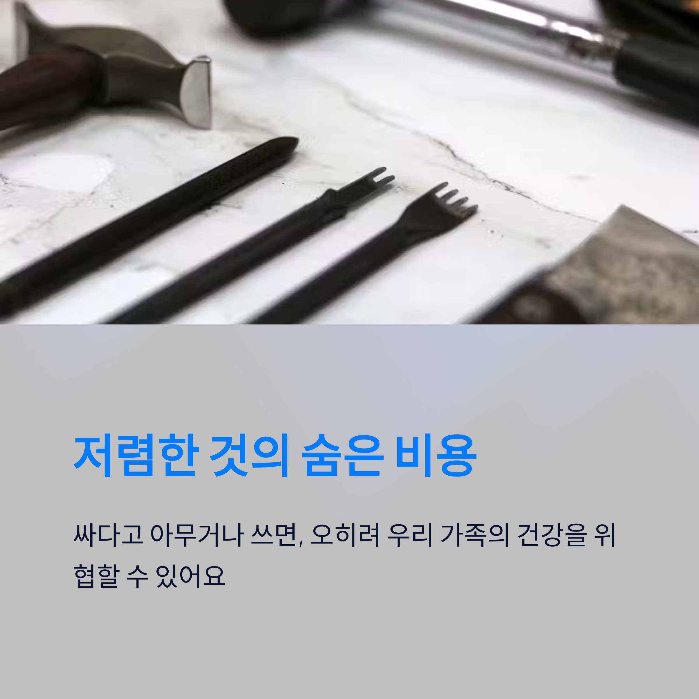 실제로 써보니 비교가 안 될 정도로 차이가 확실했습니다. 싸다고 아무거나 쓰면, 오히려 우리 가족의 건강을 위협할 수 있어요.