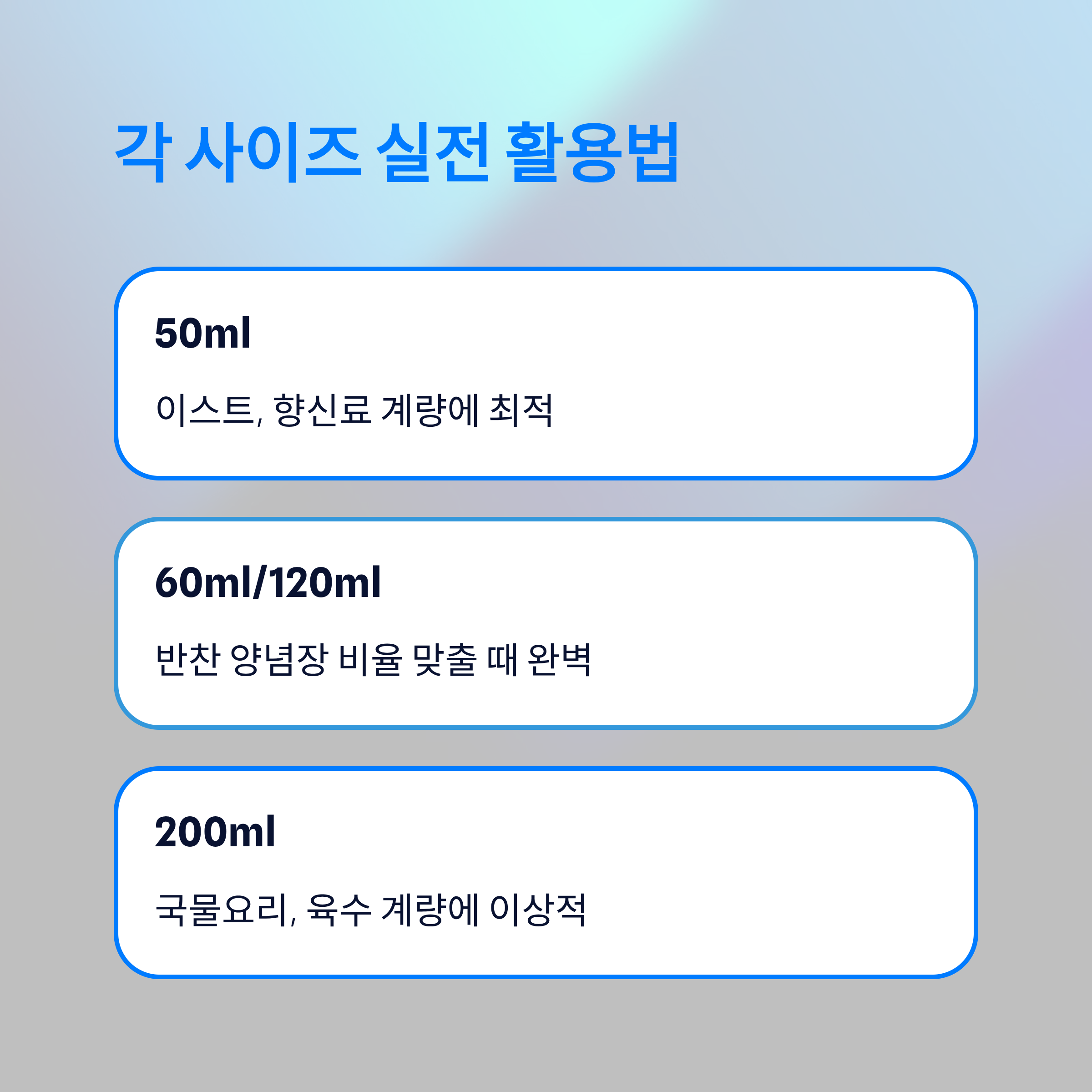 제가 구입한 세트는 50ml, 60ml, 100ml, 120ml, 200ml 총 다섯 가지로 구성되어 있었어요. 처음에는 ‘이렇게까지 필요한가?’ 싶었는데, 쓰다 보니 다 이유가 있더라고요. 예를 들어 제빵할 때 이스트를 50ml 컵에 계량하니까 실패 없이 발효가 잘 되었고, 200ml 컵은 국물 요리 간 맞출 때 딱 좋았어요.