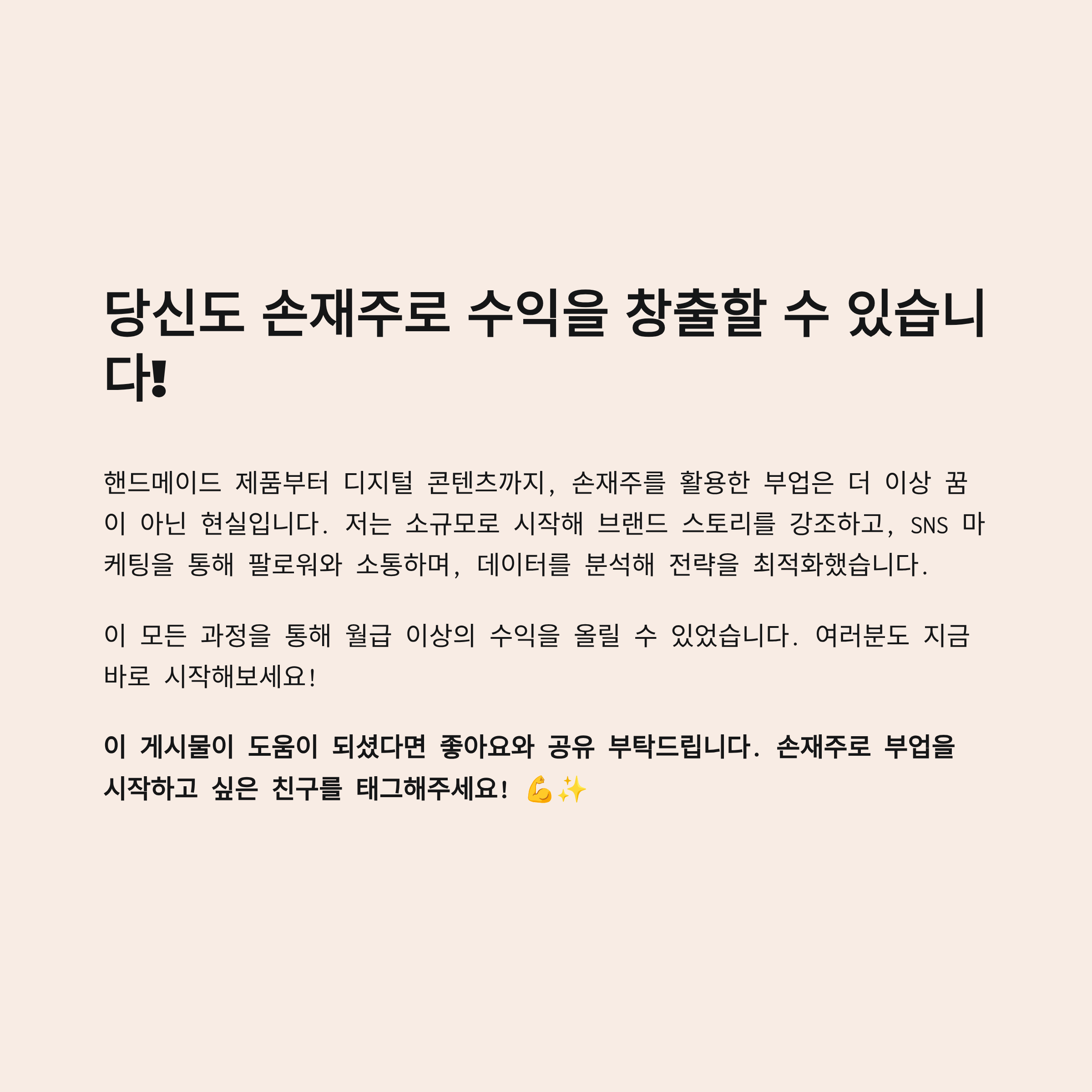 이 경험을 통해 깨달은 점은, 핸드메이드 제품이 단순히 제품만 팔리는 것이 아니라, 브랜드와 스토리를 강조하는 것이 중요하다는 것입니다. 저는 저만의 스타일과 유니크한 디자인을 내세우고, 스토리를 담은 콘텐츠를 꾸준히 올리면서 팔로워들과 소통했어요. 이런 점들이 결국 꾸준한 수익으로 이어졌고, 현재는 월급 이상을 벌 수 있는 수준이 되었습니다.
