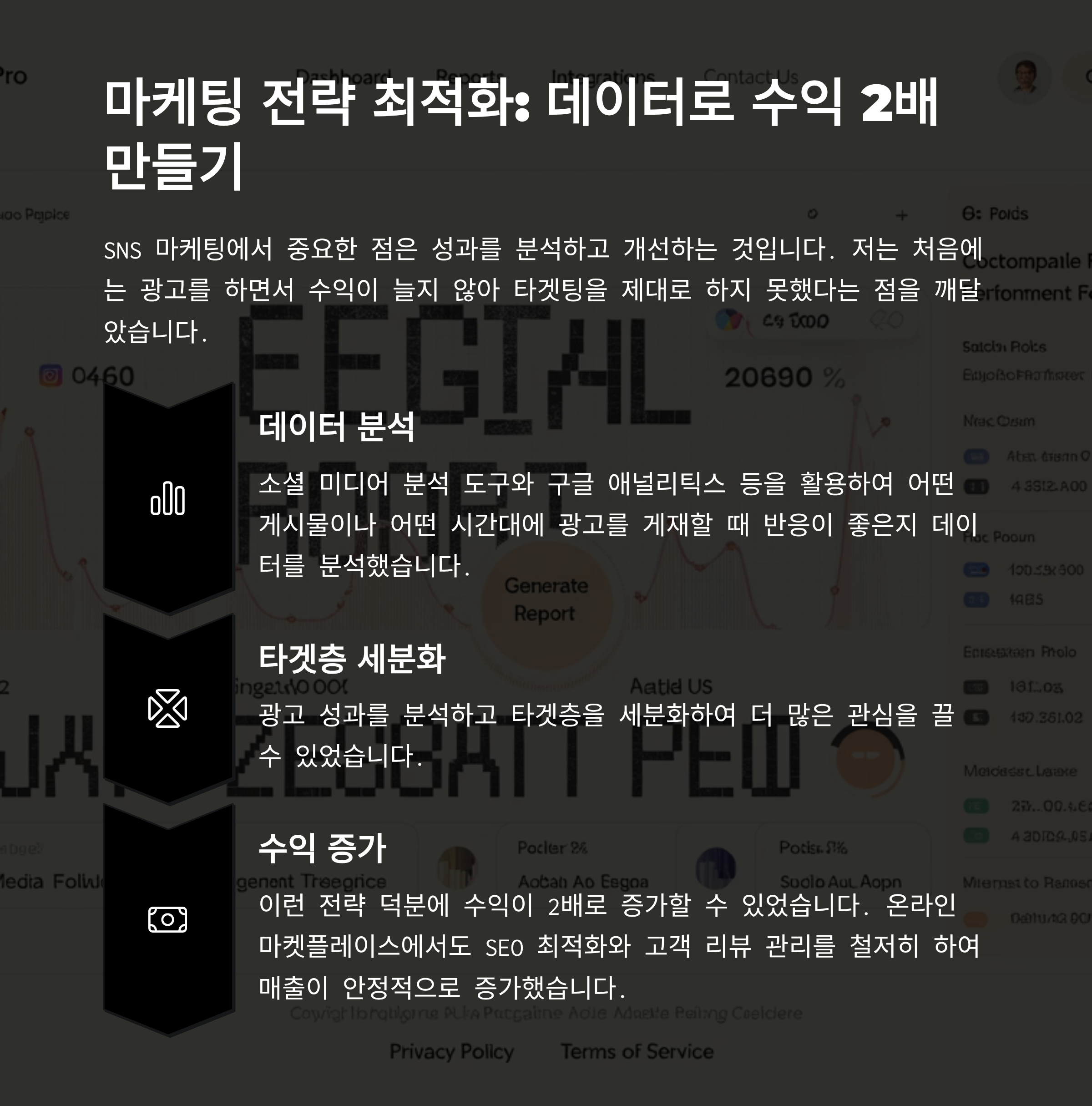 이 과정에서 소셜 미디어 분석 도구와 구글 애널리틱스 등을 활용하여 어떤 게시물이나 어떤 시간대에 광고를 게재할 때 반응이 좋은지 데이터를 분석하였고, 이를 통해 더 많은 타겟 고객을 끌어들일 수 있었습니다. 이런 전략 덕분에 수익이 2배로 증가할 수 있었습니다.