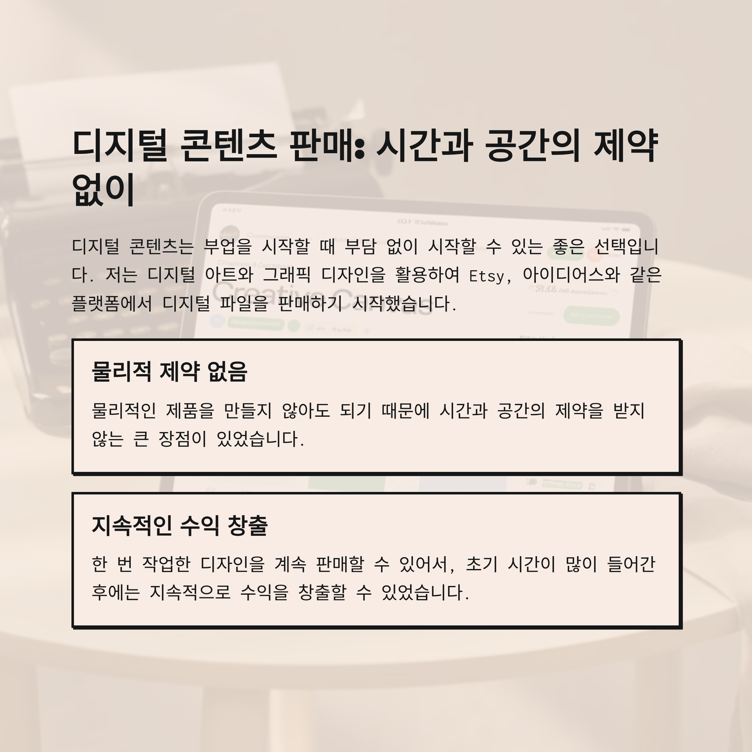 디지털 콘텐츠는 물리적인 제품을 만들지 않아도 되기 때문에 시간과 공간의 제약을 받지 않는 큰 장점이 있었습니다. 또한, 한 번 작업한 디자인을 계속 판매할 수 있어서, 초기 시간이 많이 들어간 후에는 지속적으로 수익을 창출할 수 있었습니다. 이 방식은 특히 시간에 제약이 있는 사람들에게 효과적인 방법이었습니다.