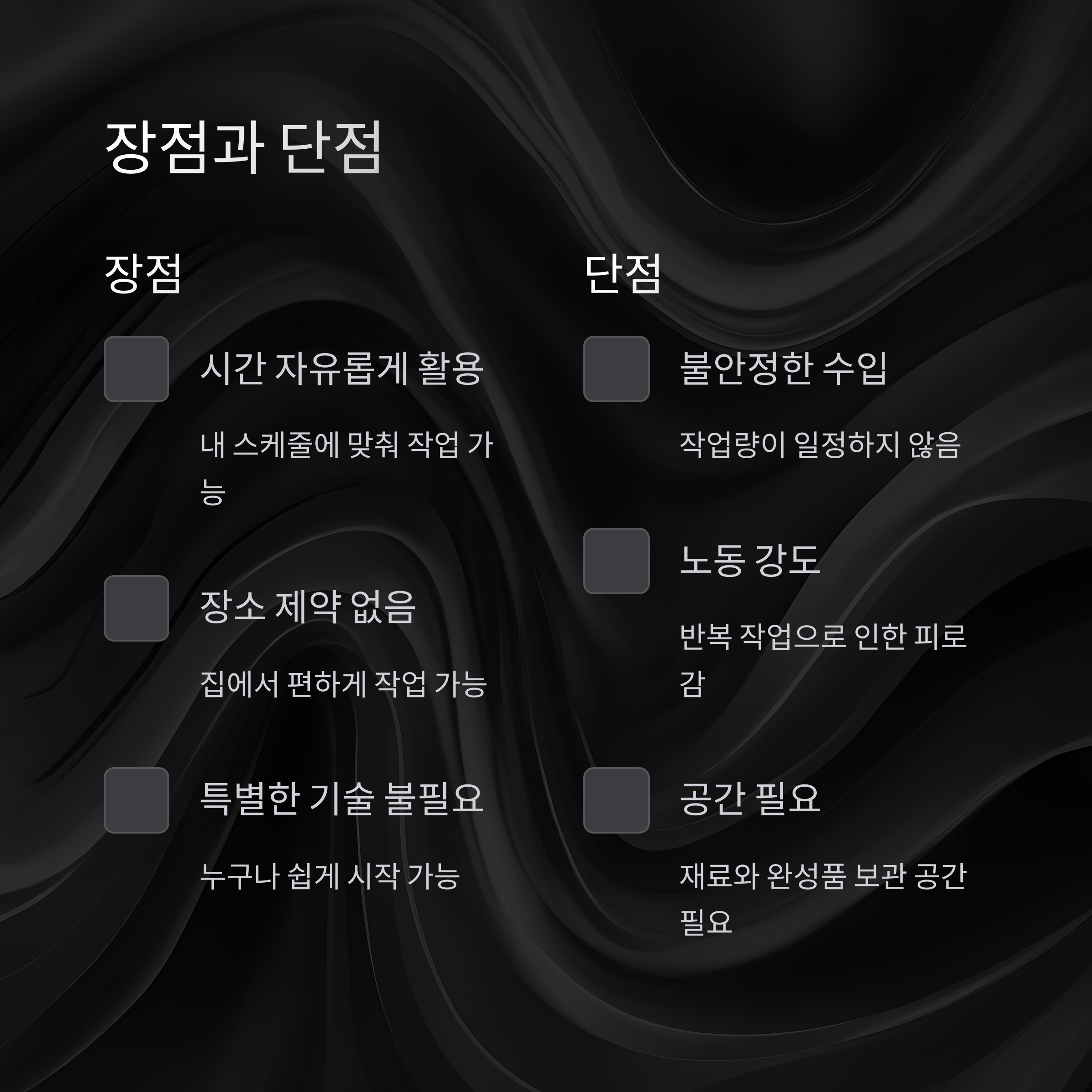 장점은 집에서 편하게 일할 수 있다는 점이었어요. 아이를 돌보면서도 할 수 있었고, 시간 조절이 자유로웠죠. 하지만 단점도 있었어요. 제품이 늦게 도착하면 작업 일정이 밀리기도 했고, 포장재가 부족하면 추가로 요청해야 하는 번거로움도 있었어요. 그래도 전반적으로는 만족스러웠어요.