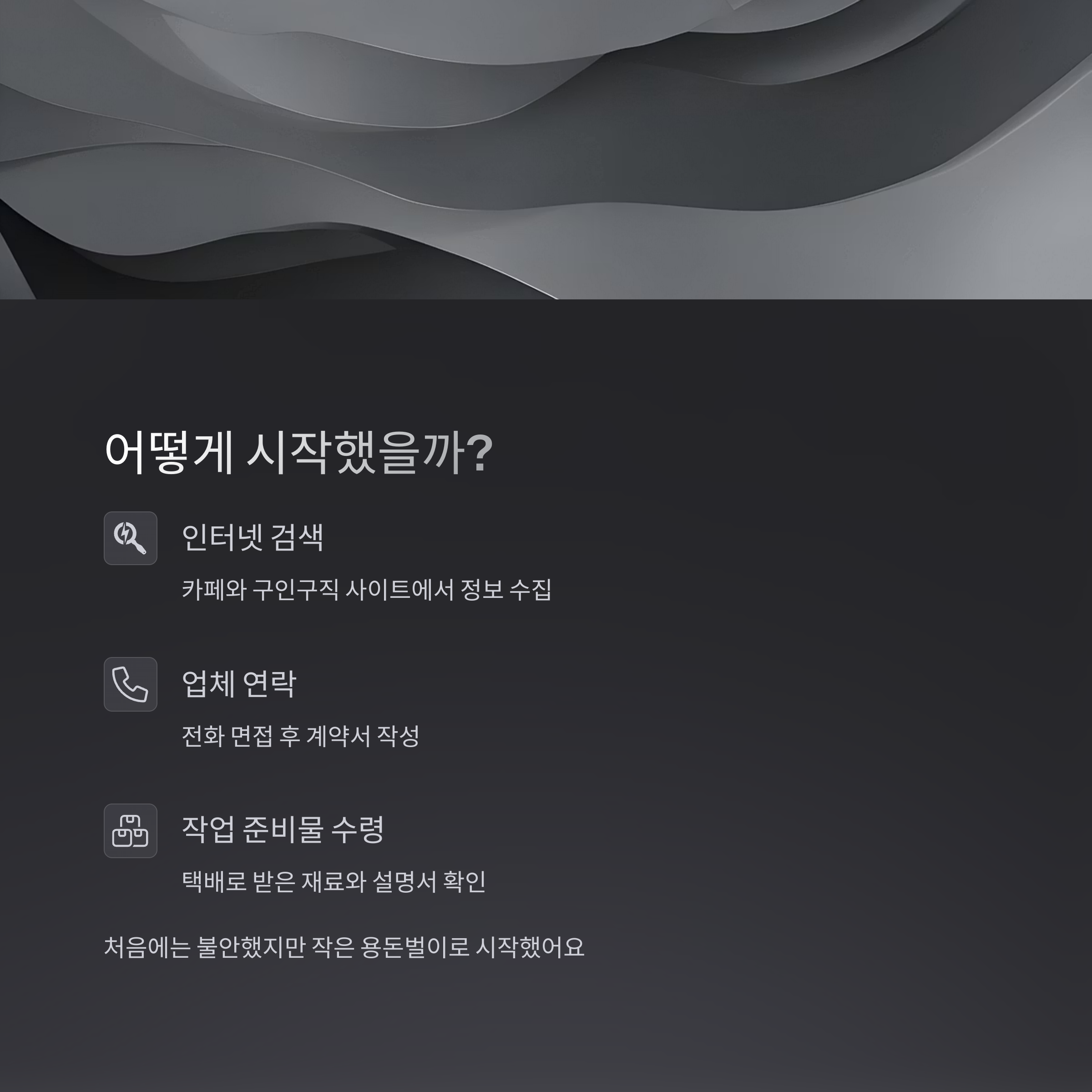 처음 손포장 부업을 알게 된 건 인스타그램 광고를 통해서였어요. "하루 2시간, 집에서 간단하게 돈 벌기"라는 문구에 혹해서 클릭했죠. 상담을 신청하니 바로 연락이 왔고, 제품 포장 작업을 소개받았어요. 처음엔 의심도 했지만, 상담 과정에서 자세한 설명을 듣고 나니 신뢰가 생기더라고요. 그래서 시작하게 되었죠.