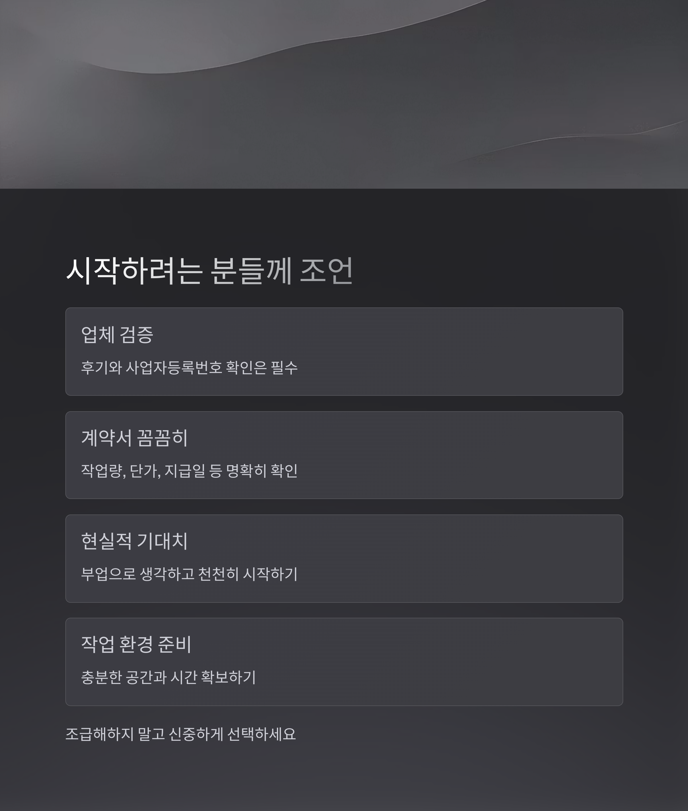 손포장 부업을 시작하려는 분들께는 몇 가지 조언을 드리고 싶어요. 첫째, 업체의 신뢰도를 확인하세요. 둘째, 작업량과 수익을 현실적으로 계산해보세요. 셋째, 자신의 생활 패턴에 맞는지 고려하세요. 마지막으로, 처음부터 큰 수익을 기대하기보다는 부업으로서의 의미를 두는 것이 좋아요.