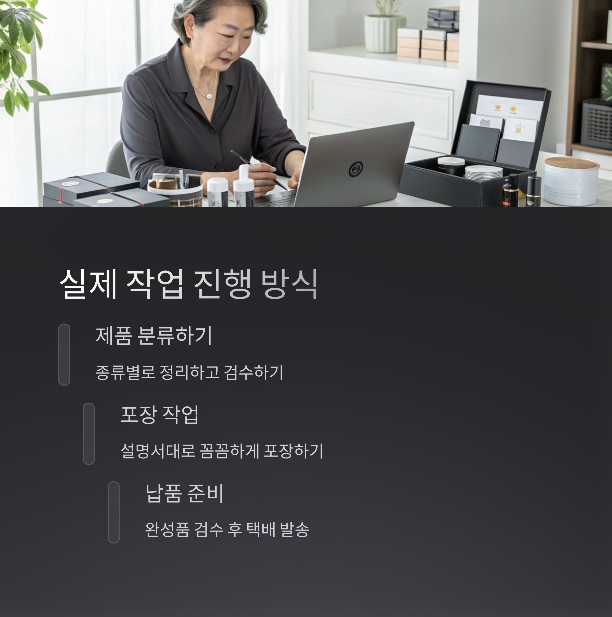작업은 주로 화장품 샘플 포장이었어요. 제품과 포장재가 집으로 배송되면, 정해진 방식대로 포장해서 다시 보내는 방식이었죠. 하루에 2~3시간 정도 투자하면 100~150개 정도 포장할 수 있었어요. 처음엔 손이 느려서 시간이 좀 걸렸지만, 익숙해지니 속도가 붙더라고요. ㅋㅋ