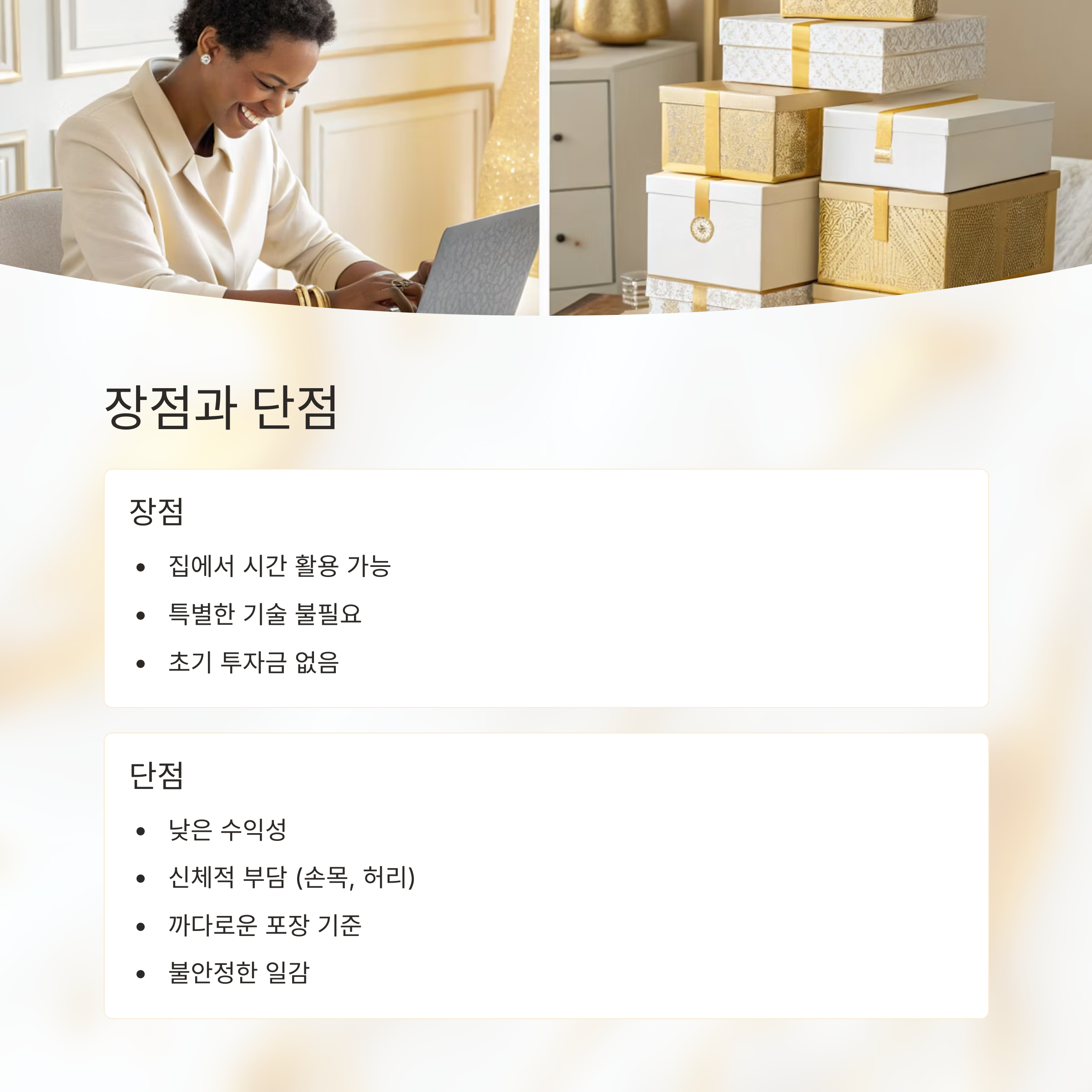 제 경험에 따르면 손포장 부업은 장점과 단점이 분명해요. 솔직하게 적어볼게요.