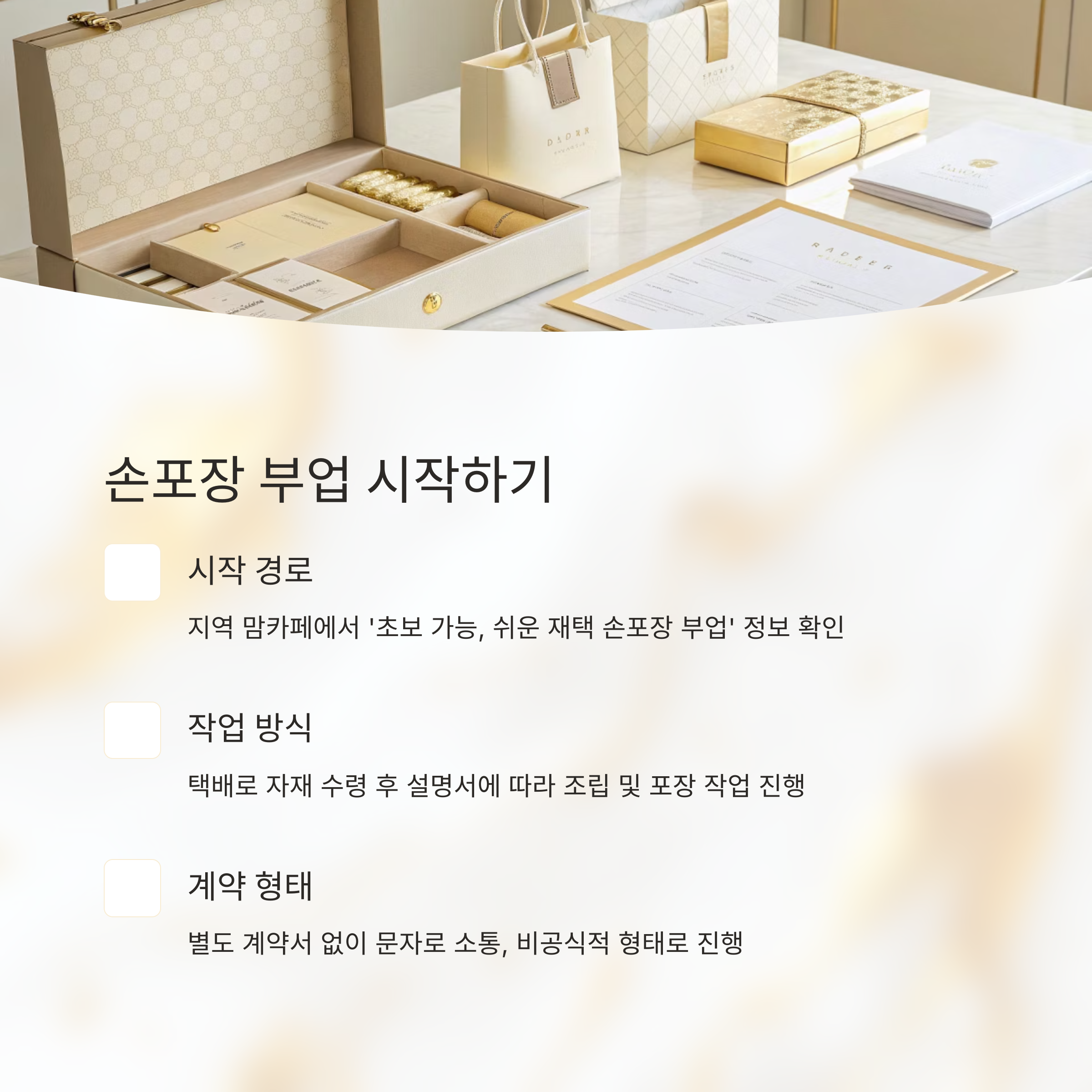 처음에는 지역 맘카페에서 ‘초보 가능, 쉬운 재택 손포장 부업’이라는 글을 보고 연락했어요. 택배로 자재 받고, 설명서 보며 하나하나 조립과 포장하는 작업이었죠. 포장할 물건은 향균 물티슈 샘플이었고, 개당 단가는 80원이었습니다. 작업 시작 전 계약서도 따로 없고, 문자로 주고받는 정도였어요.