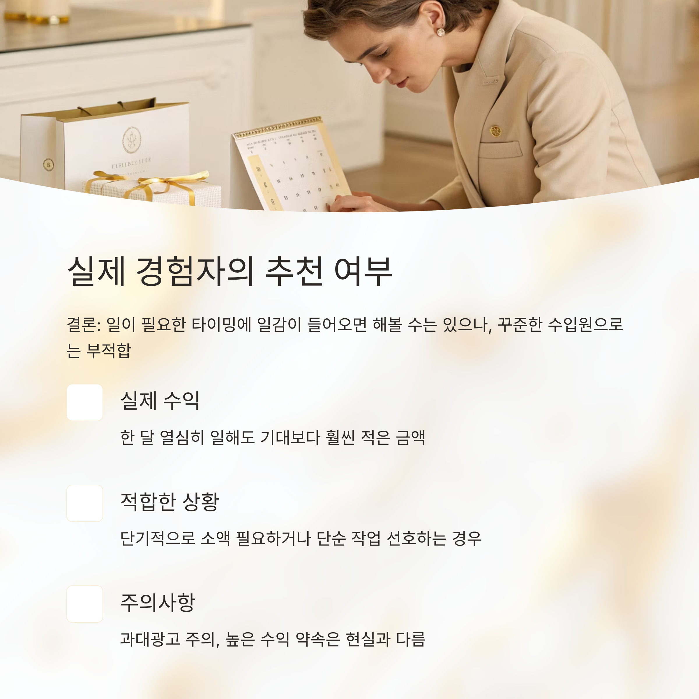 다만, 단기적으로 몇만 원이라도 당장 필요한 상황이거나, 몸 움직이면서 단순노동 좋아하시는 분이라면 해볼 가치는 있습니다. 하지만 과대광고, 특히 '재택으로 200만 원 수익' 이런 말은 믿지 마세요. 제가 보기엔 그런 건 현실에 없어요.