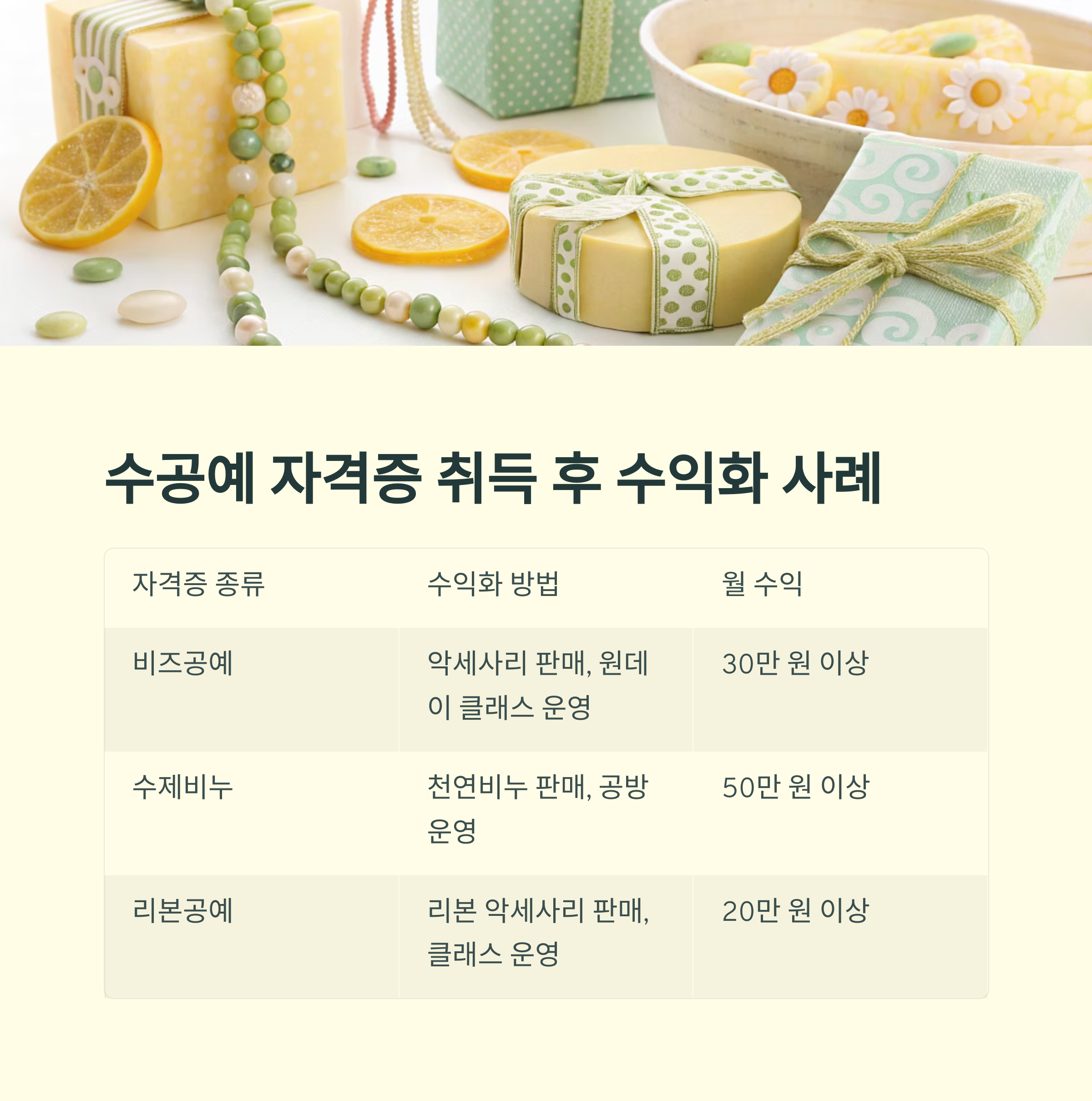수공예 자격증 중에서도 비즈공예, 리본공예, 수제비누 제작 등은 비교적 수익화가 쉬운 편입니다. 예를 들어, 비즈공예 자격증을 취득하면 악세사리 제작과 판매, 원데이 클래스 운영 등 다양한 수익 활동이 가능합니다. 또한, 수제비누 자격증을 취득하면 천연비누를 제작하여 판매하거나 공방을 운영할 수 있습니다.