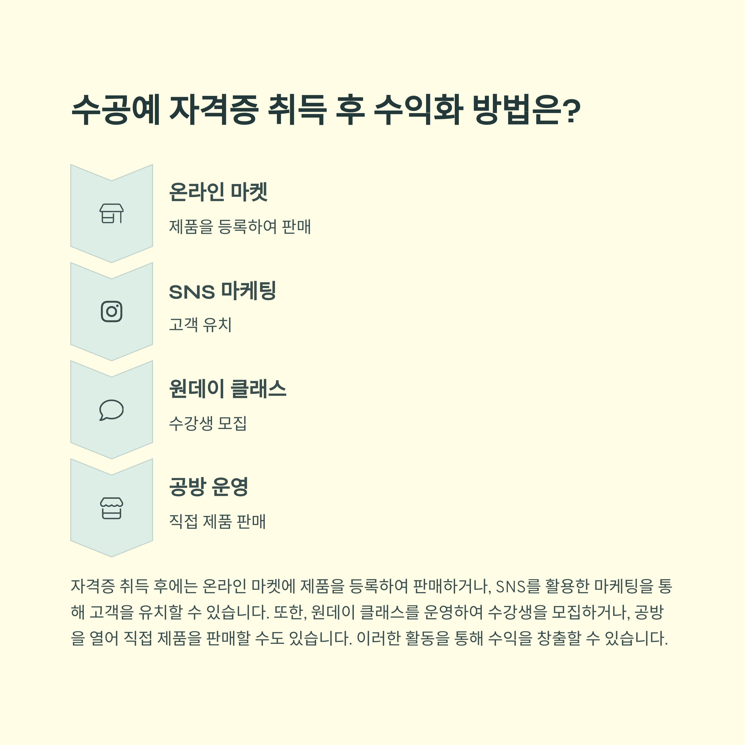 자격증 취득 후에는 온라인 마켓에 제품을 등록하여 판매하거나, SNS를 활용한 마케팅을 통해 고객을 유치할 수 있습니다. 또한, 원데이 클래스를 운영하여 수강생을 모집하거나, 공방을 열어 직접 제품을 판매할 수도 있습니다. 이러한 활동을 통해 수익을 창출할 수 있습니다.