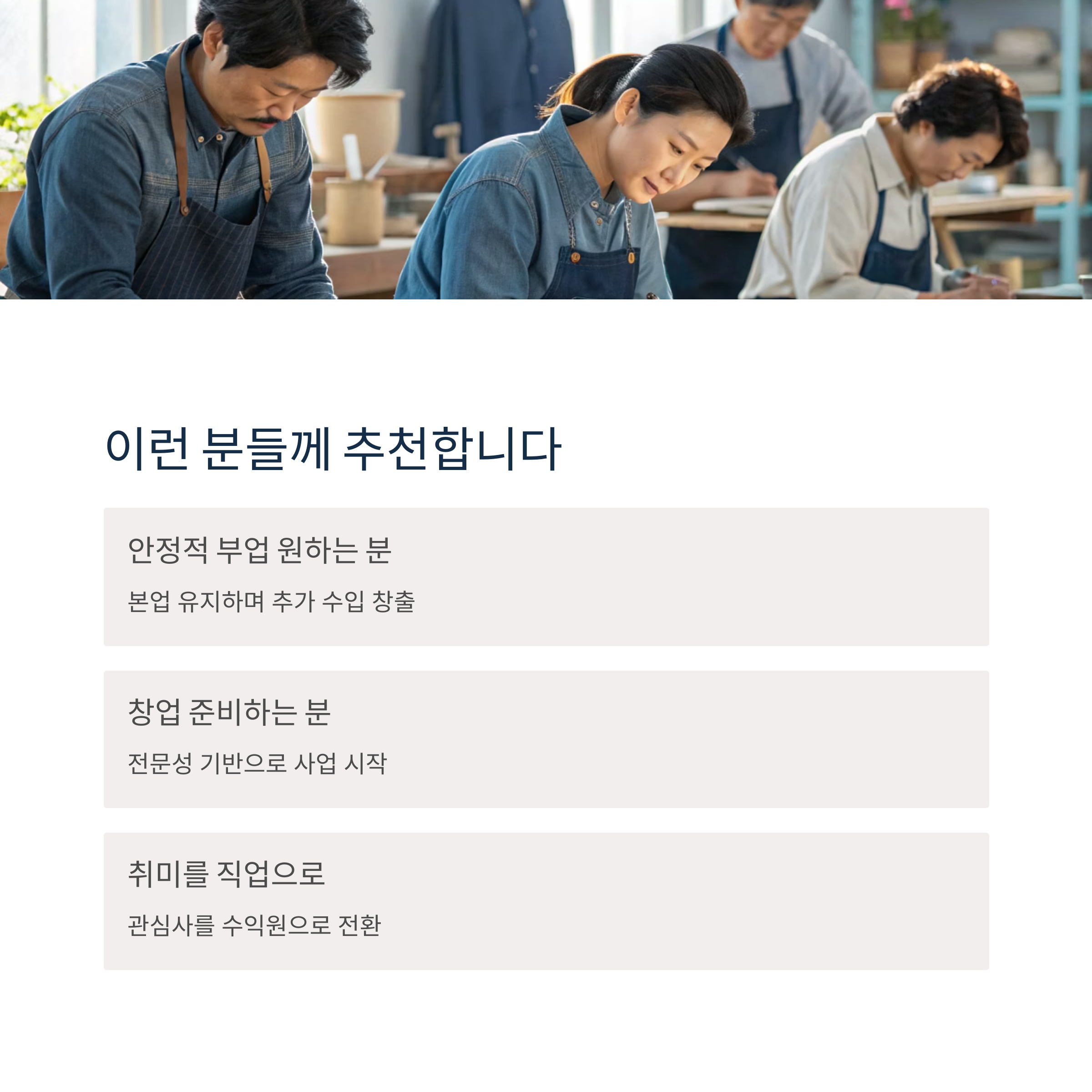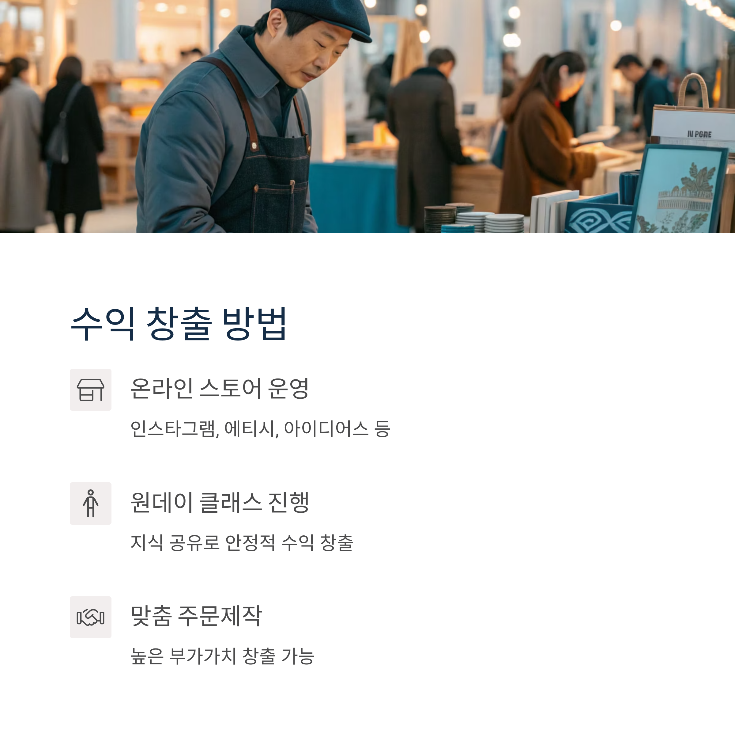 - 공방 창업: 작은 공방을 열어 직접 제품을 제작하고 판매할 수 있습니다.(창업부업지원센터)