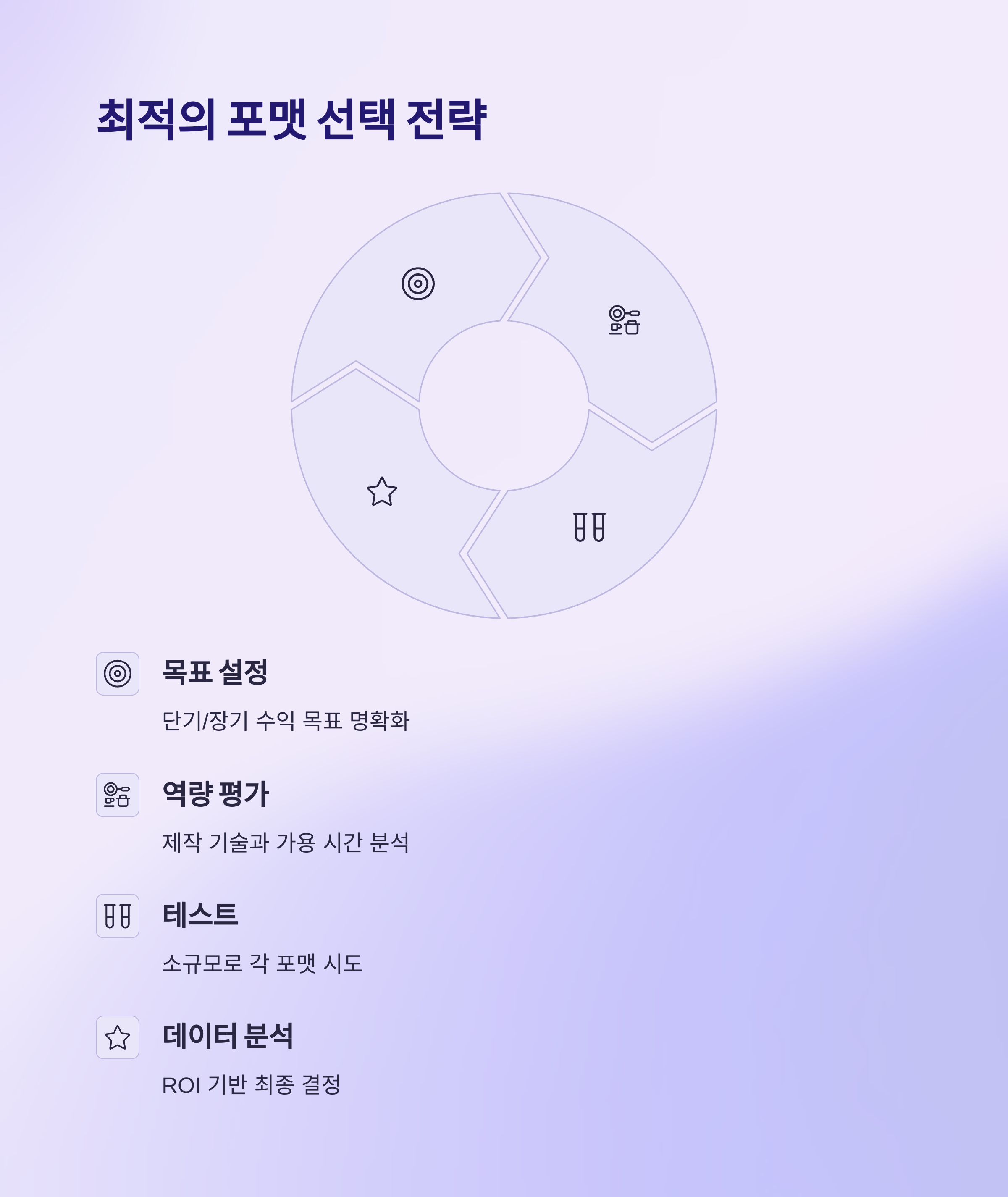 결론적으로 어떤 포맷이 최고다 라고 단정짓기 어렵습니다. 목표, 리소스, 성향에 따라 다르거든요. 그래서 저는 3단계 전략을 추천드려요.