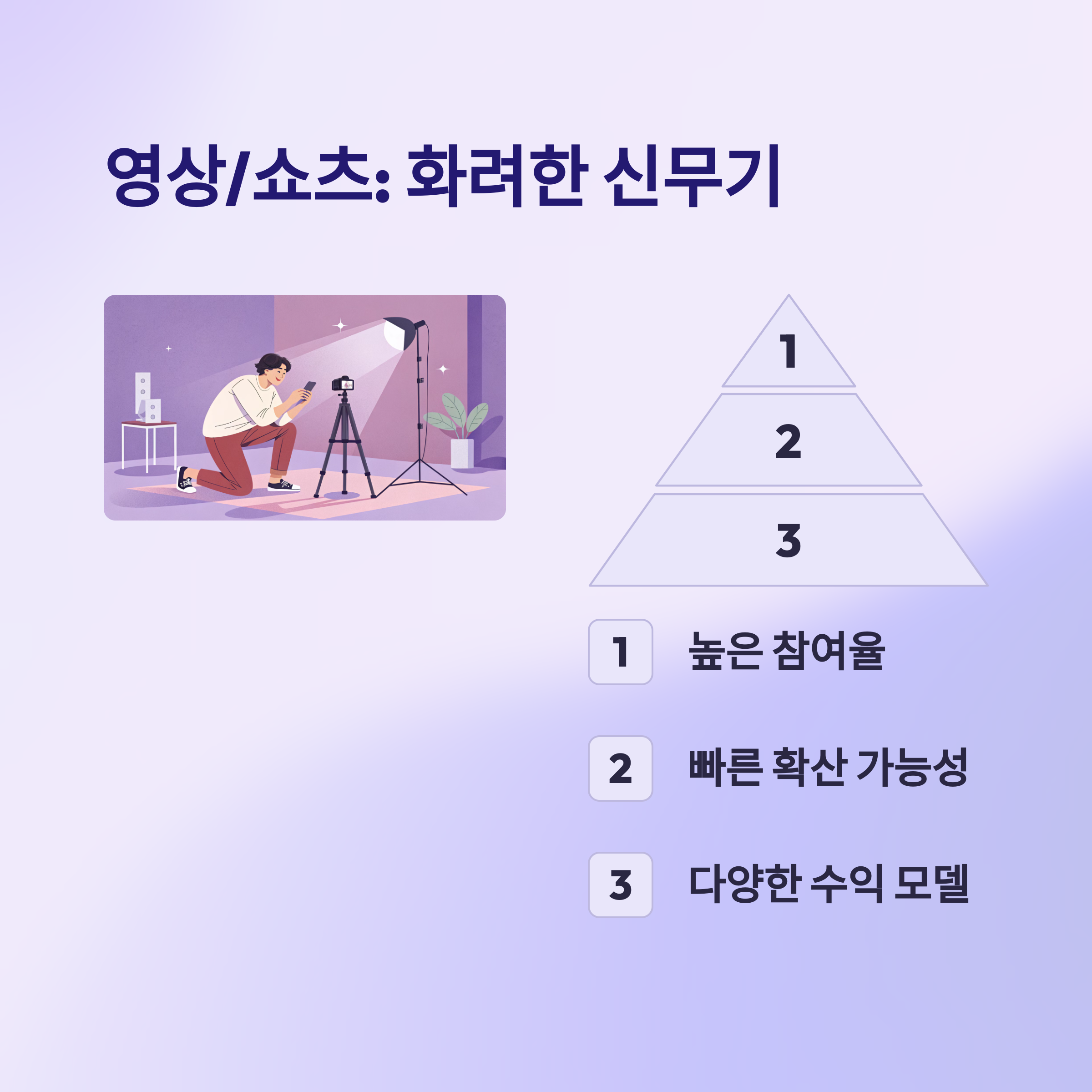 | 쇼츠 | 간접 광고, 브랜드 노출, 팬 수익화 | 빠른 확산력, 짧은 제작시간 |