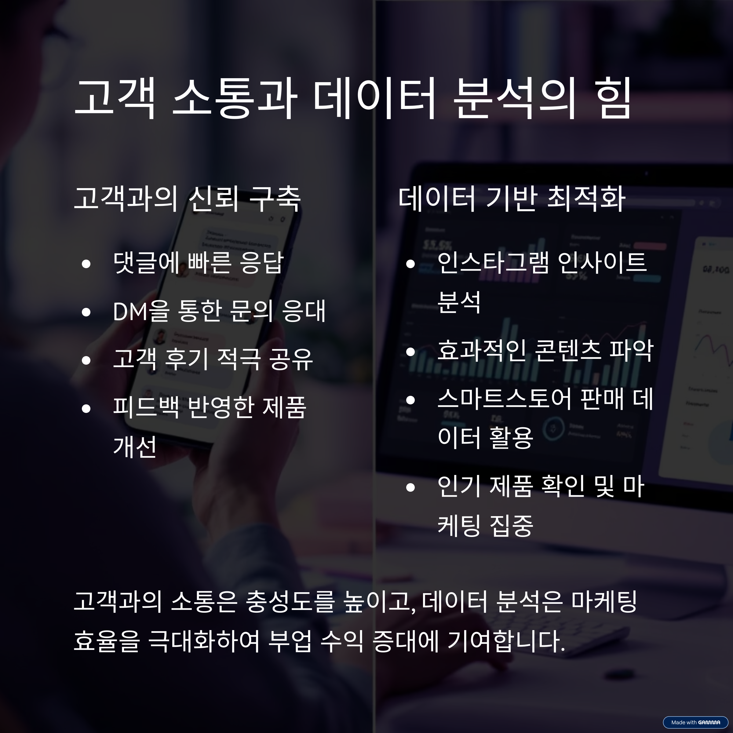 인스타그램과 스마트스토어의 데이터를 분석하여 마케팅 전략을 최적화할 수 있습니다. 인스타그램의 인사이트를 활용하여 어떤 콘텐츠가 효과적인지 파악하고, 스마트스토어의 판매 데이터를 분석하여 인기 제품을 확인합니다. 이러한 데이터 기반의 전략은 마케팅 효율을 높이고, 부업 수익을 극대화하는 데 도움이 됩니다.