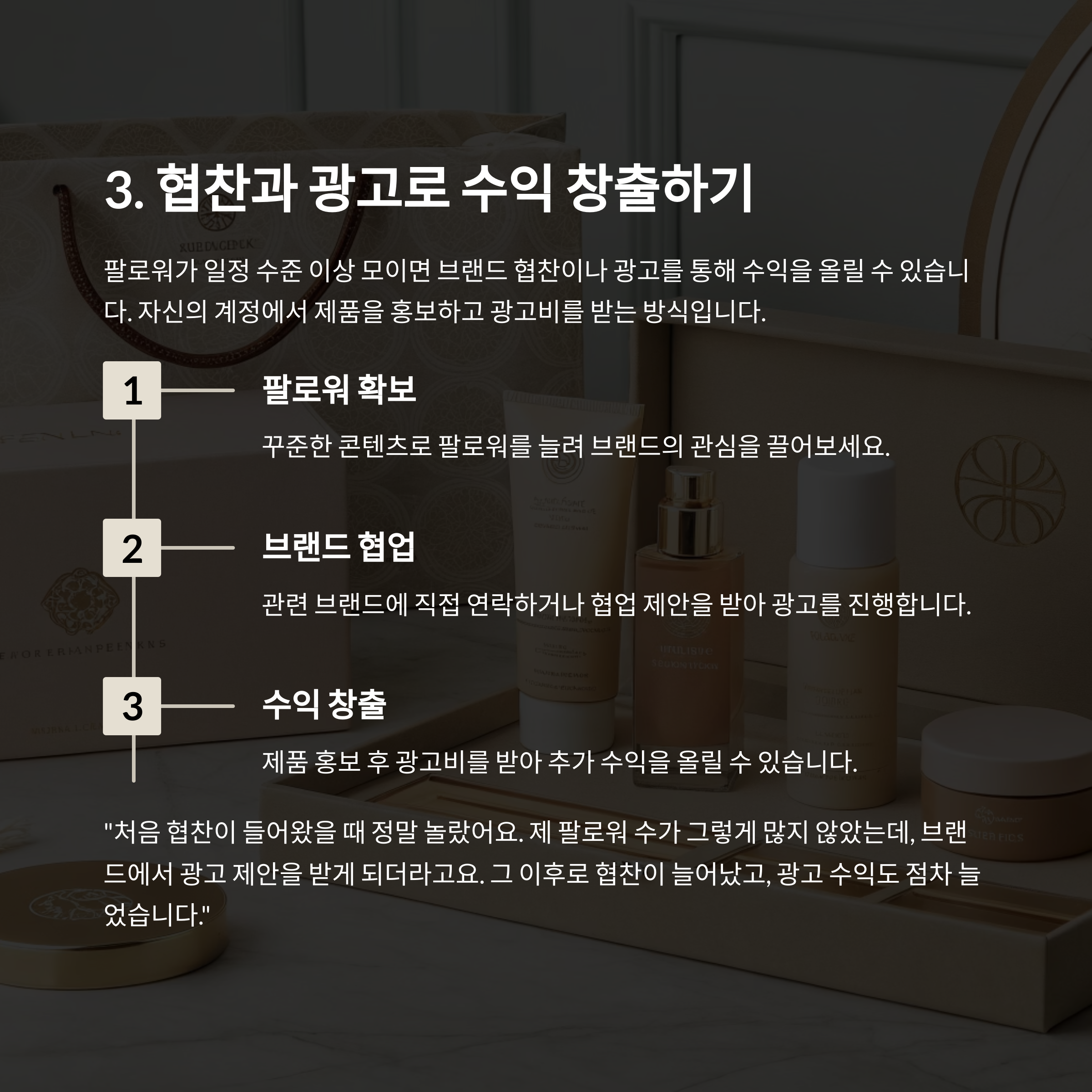 인스타그램에서 팔로워가 일정 수 이상이 되면, 브랜드 협찬이나 광고를 받을 기회도 생깁니다. 저는 팔로워가 일정 수를 넘긴 후, 뷰티 제품이나 패션 브랜드와 협업을 통해 광고 수익을 올렸습니다. 브랜드가 저의 계정에서 제품을 홍보해주면, 광고비가 들어오는 방식입니다.
