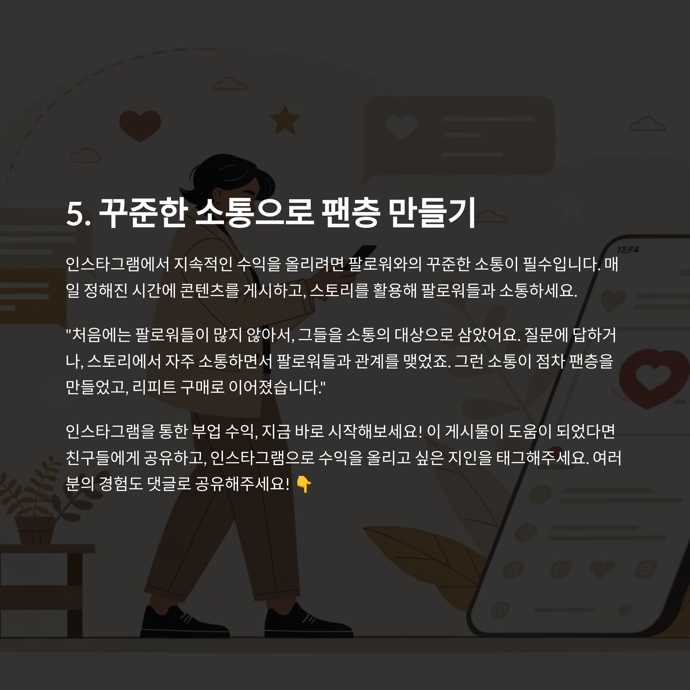 인스타그램을 통해 꾸준한 소득을 얻으려면, 팔로워와의 꾸준한 소통이 필요합니다. 저는 매일 정해진 시간에 제품이나 브랜드 관련 콘텐츠를 게시하며 팔로워와의 관계를 유지했습니다. 스토리를 활용하여 팔로워들과 소통하고, 제품에 대한 질문에 답하면서 고객의 니즈를 파악하는 것이 중요합니다.