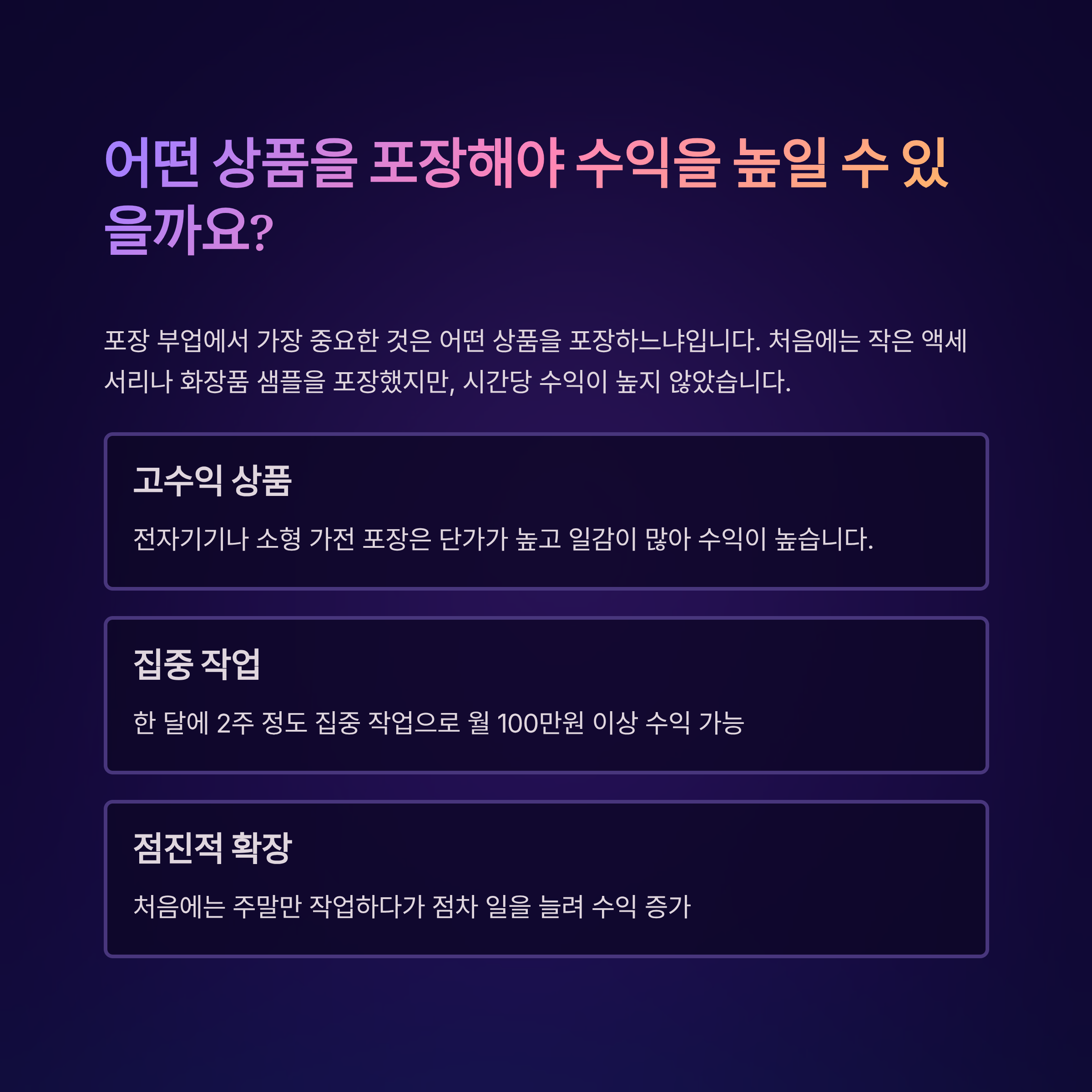 포장 부업을 하면서 가장 중요한 건 어떤 상품을 포장할지였어요. 처음에는 작은 액세서리나 화장품 샘플을 포장했는데, 시간당 수익이 높지 않았어요. 그래서 다른 상품들을 찾아봤고, 고수익 상품으로 전자기기나 소형 가전을 포장하는 일을 시작했습니다. 이런 상품들은 물건이 좀 더 고급스럽고, 포장이 까다로워서 일감이 많고 수익도 높았습니다.