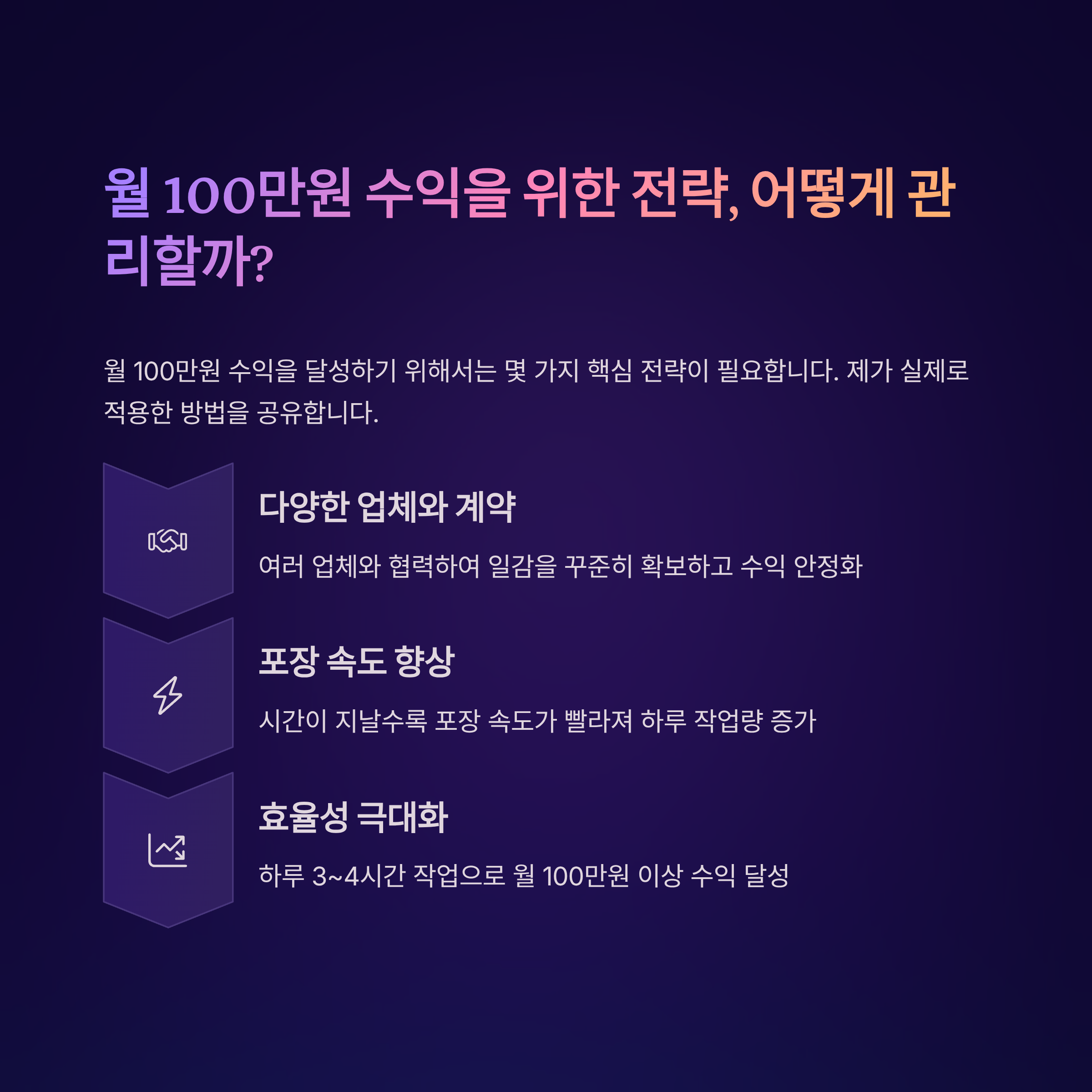 또한, 포장 속도를 빠르게 하고, 작업 효율성을 높이는 것도 중요한 전략이었어요. 처음엔 한 번에 한 개씩 포장하는 데 시간이 많이 걸렸지만, 시간이 지날수록 포장 속도가 빨라졌고, 하루에 할 수 있는 양이 늘어나면서 수익도 많아졌습니다. 이렇게 효율성을 높여가면서, 하루에 3~4시간 정도 일했을 때 월 100만원 이상을 벌게 되었죠.