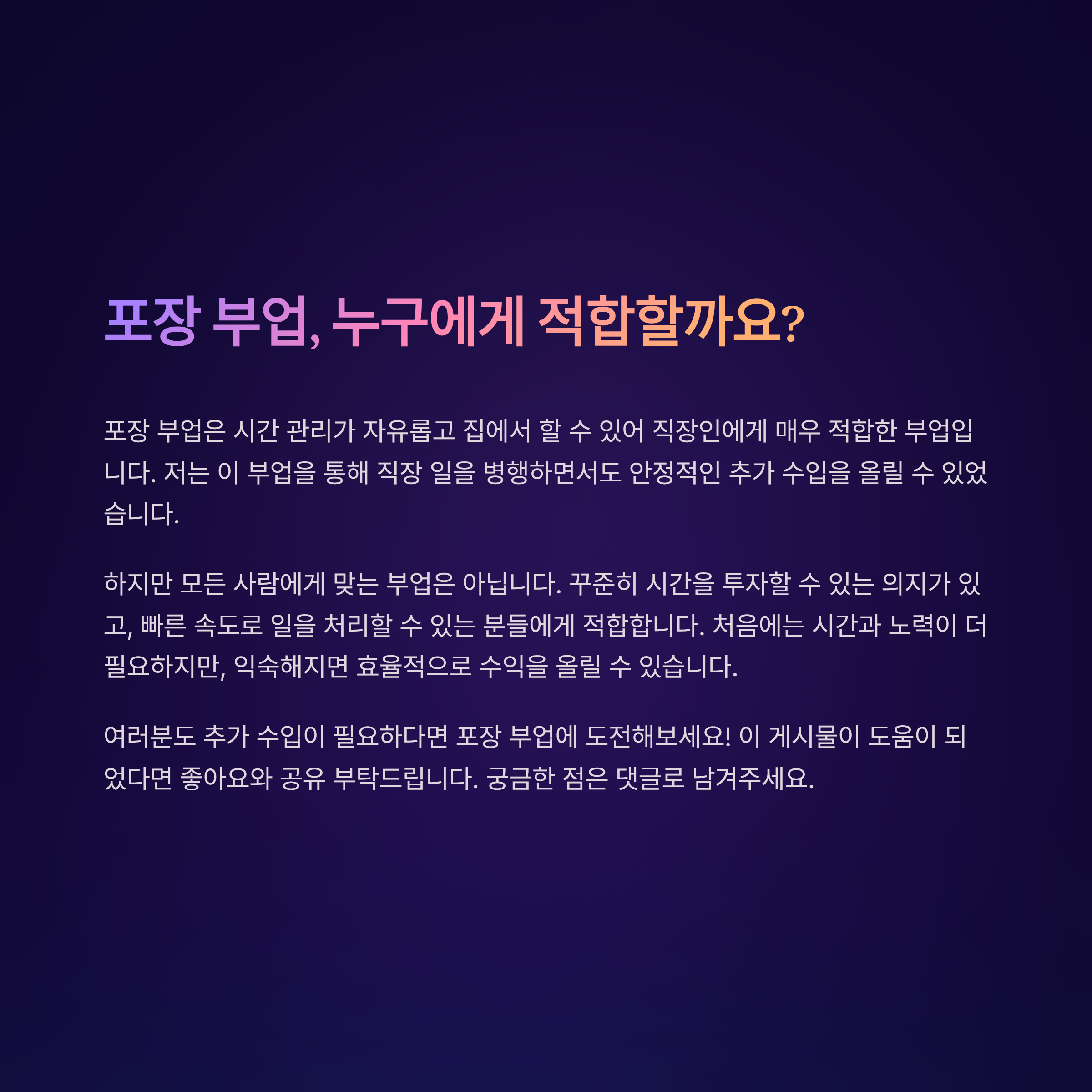 포장 부업은 직장인에게 정말 적합한 부업이라고 생각합니다. 특히, 자유로운 시간 관리가 가능하고, 집에서 할 수 있기 때문에 직장 일을 하면서 부업을 할 수 있습니다. 저는 포장 부업을 하면서 꾸준한 수익을 얻을 수 있었고, 직장 일을 병행하면서도 충분히 안정적인 추가 수입을 올릴 수 있었어요.