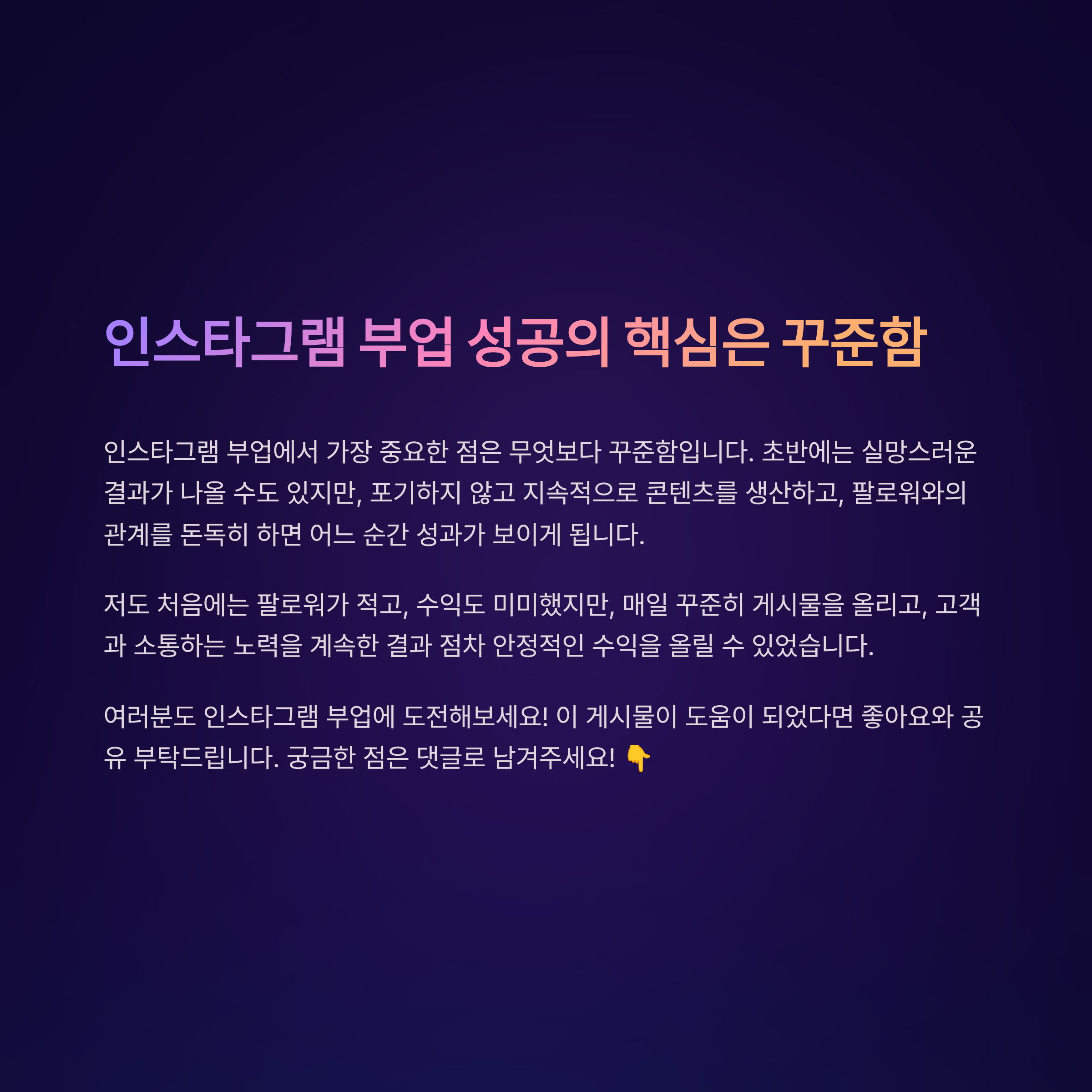 인스타그램 부업에서 중요한 점은 무엇보다 꾸준함입니다. 초반에는 실망스러운 결과가 나올 수도 있지만, 포기하지 않고 지속적으로 콘텐츠를 생산하고, 팔로워와의 관계를 돈독히 하면 어느 순간 성과가 보이게 됩니다. 저도 처음에는 팔로워가 적고, 수익도 미미했지만, 매일 꾸준히 게시물을 올리고, 고객과 소통하는 노력을 계속한 결과 점차 안정적인 수익을 올릴 수 있었습니다.