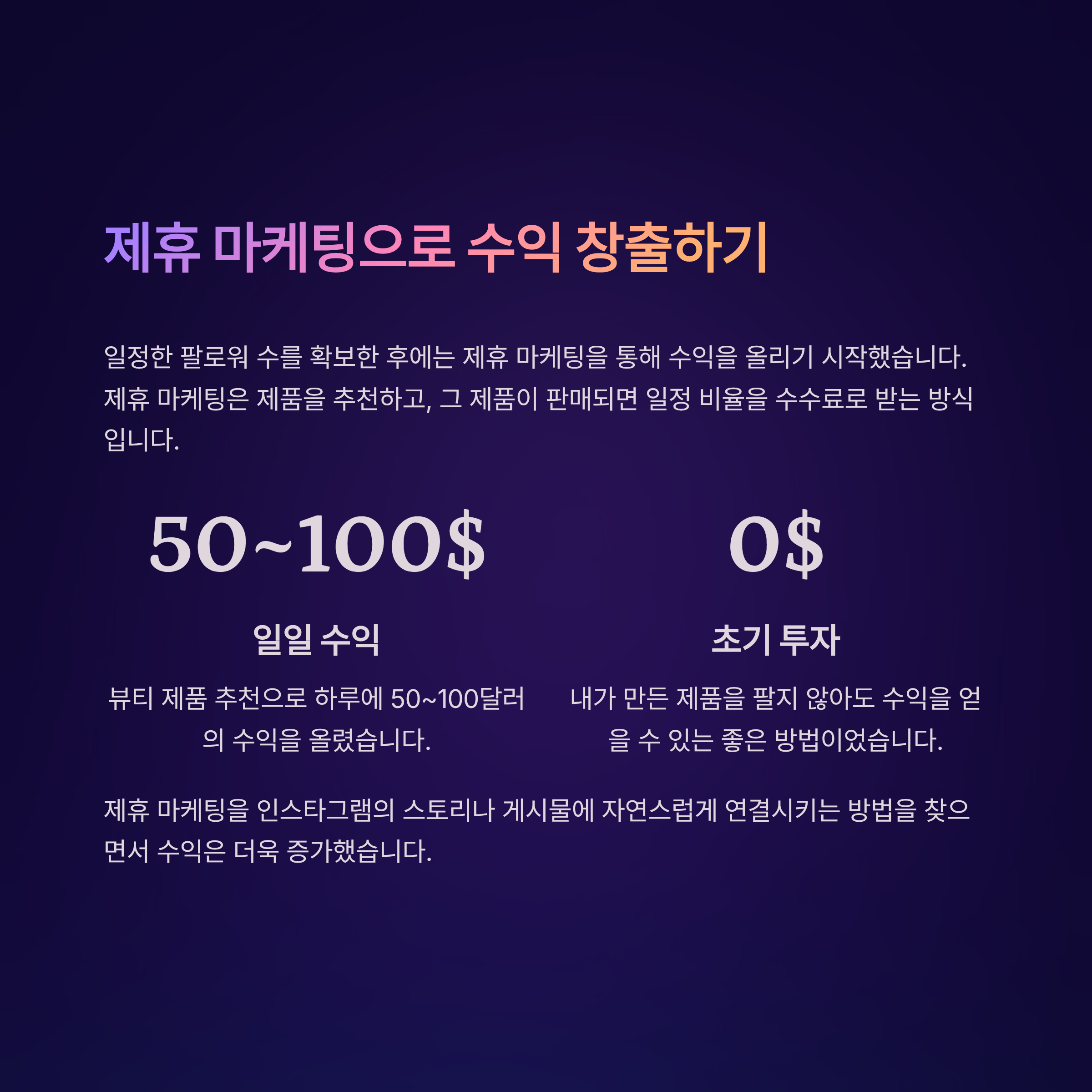 저는 처음에 뷰티 제품을 추천했는데, 예상보다 많은 사람들이 그 제품에 관심을 가졌습니다. 그 결과 하루에 50~100달러 정도의 수익을 올리게 되었고, 점차 이 수익은 늘어갔습니다. 제휴 마케팅을 시작하고, 이를 인스타그램의 스토리나 게시물에 자연스럽게 연결시키는 방법을 찾으면서 수익은 더욱 증가했습니다.