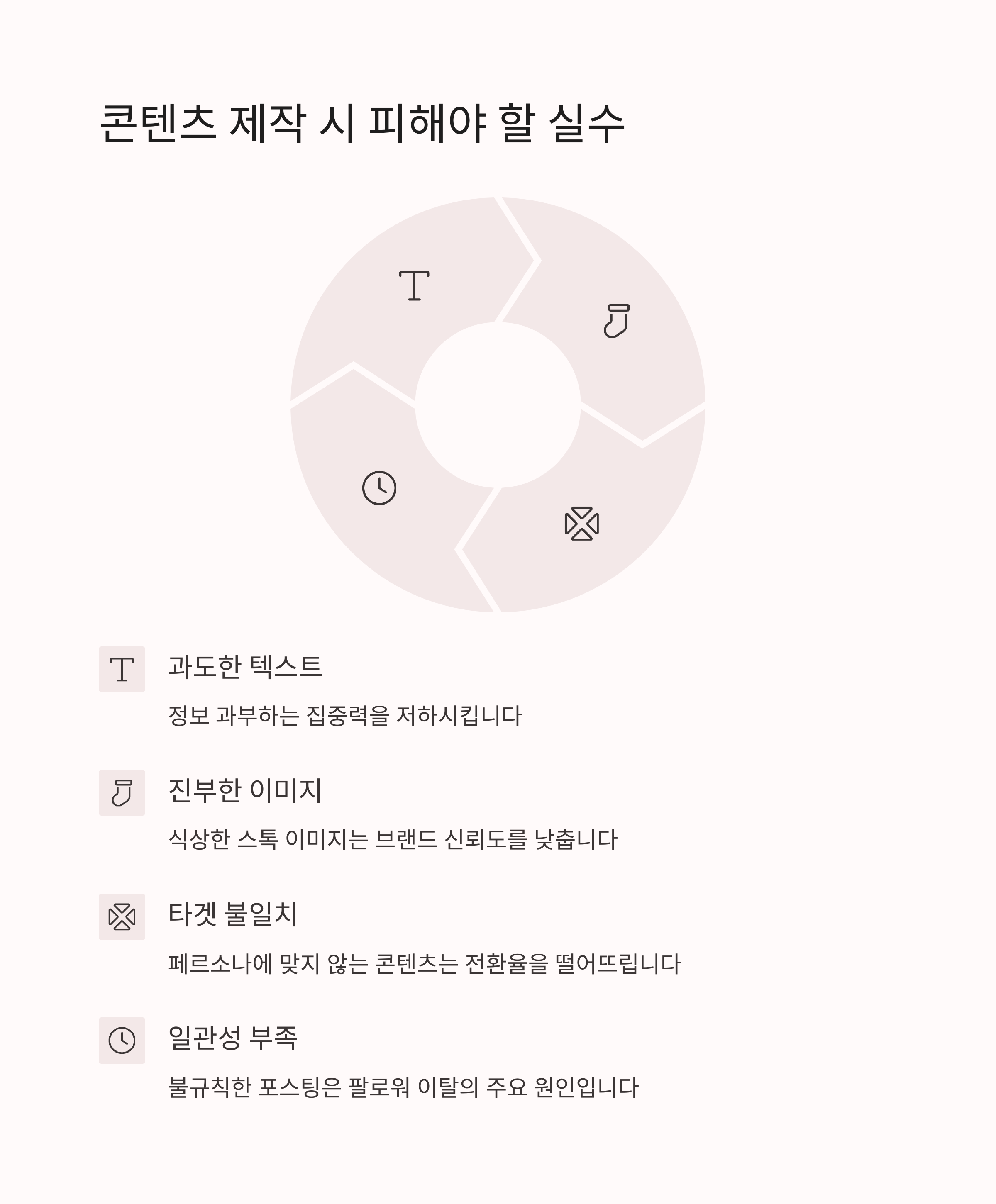 전환을 목적으로 한 콘텐츠일수록 몇 가지 유의해야 할 점이 있어요. 먼저 과도한 편집이나 광고 느낌은 피해야 합니다. 사람들은 너무 인위적인 콘텐츠에 거부감을 가지거든요. 두 번째는 정보의 과잉입니다. 한 게시물에 너무 많은 정보를 담으면 오히려 핵심이 묻혀요. ‘하나의 메시지’에 집중하세요. 마지막으로 해시태그나 위치태그 등 검색 최적화 요소도 빠뜨리면 안 됩니다. 전환은 노출이 기반이 되니까요.