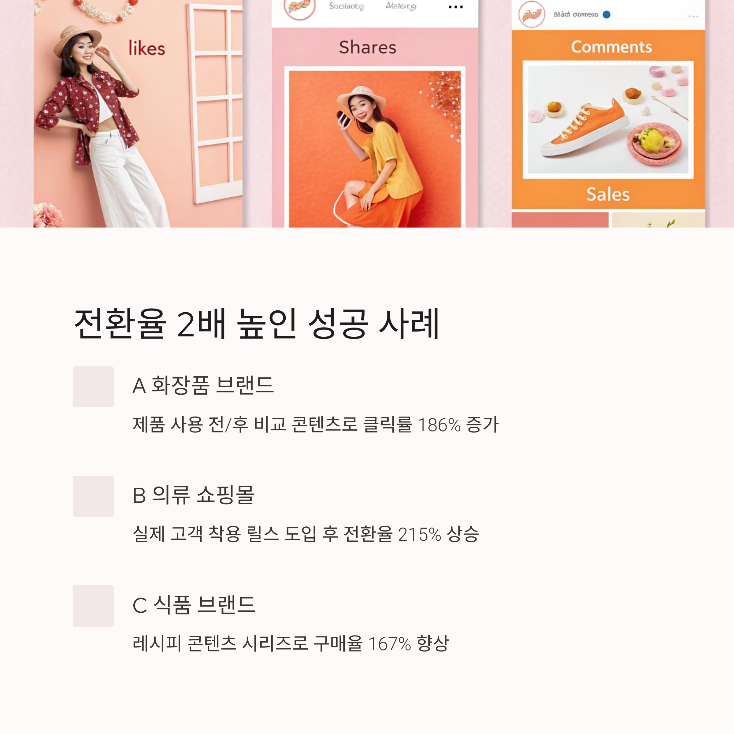 전환율이 높은 콘텐츠에는 일정한 패턴이 있어요. 후기 콘텐츠, 전후 비교 이미지, 제품 사용법 영상, 그리고 전문가 인터뷰 등이 대표적입니다. 특히 ‘리뷰 기반 콘텐츠’는 신뢰를 높여주는 효과가 크죠. 또 '릴스' 형식의 짧고 강렬한 영상은 소비자의 관심을 끌고 행동을 유도하는 데 탁월합니다. 실시간 사용 모습, 개봉기, Q&A 콘텐츠도 좋은 반응을 얻어요.
