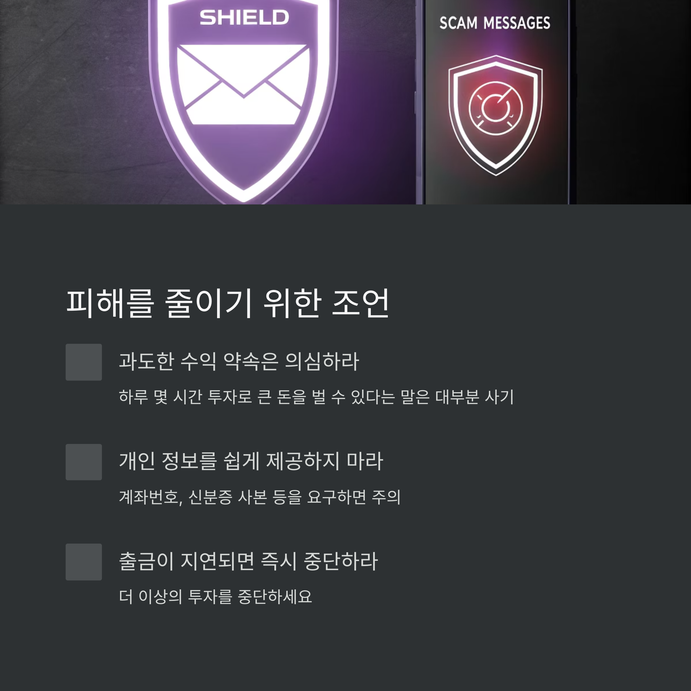- 개인 정보를 쉽게 제공하지 마라: 계좌번호, 신분증 사본 등을 요구하면 주의하세요.