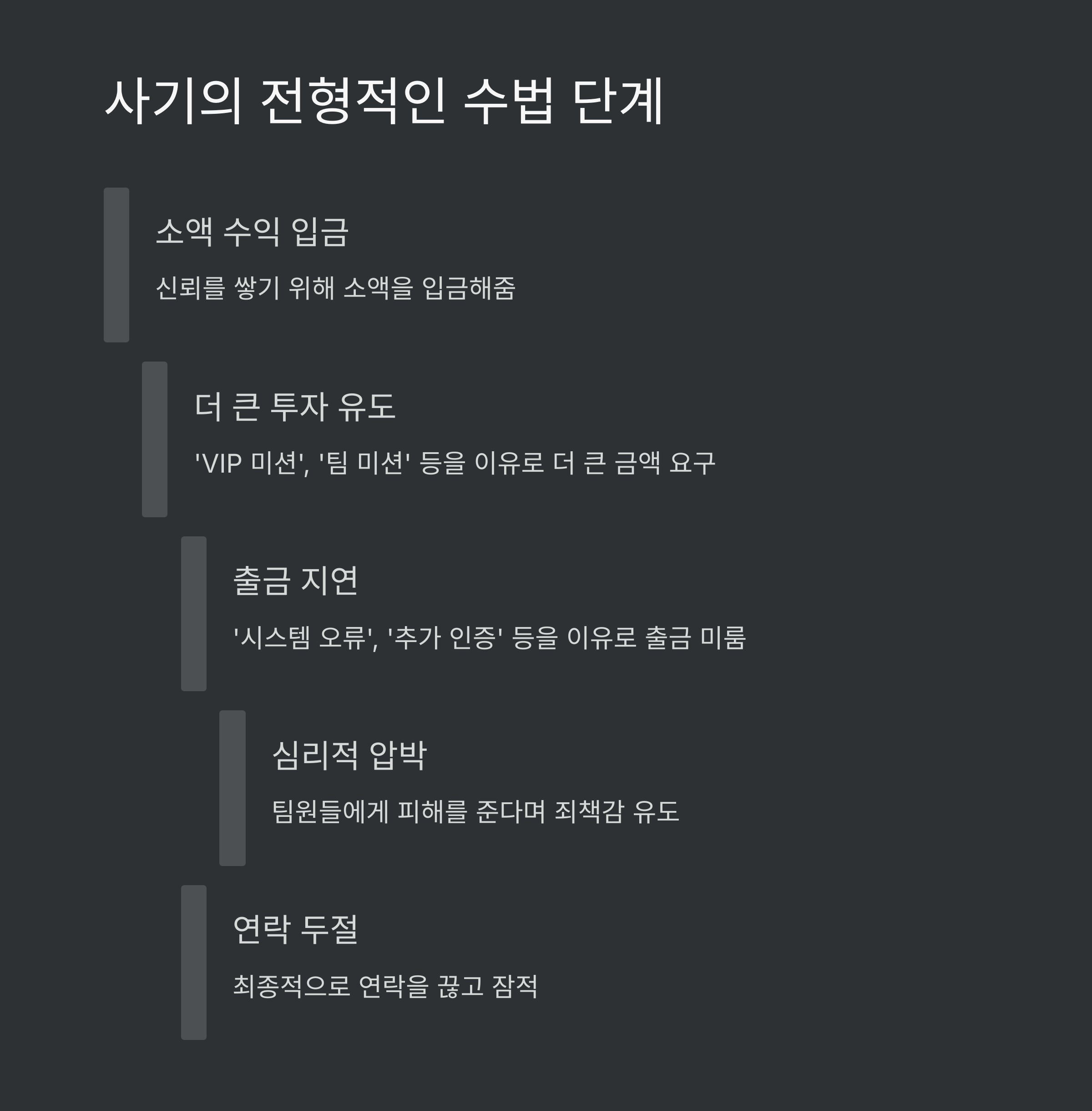 | 2단계 | 더 큰 투자 유도 | 'VIP 미션', '팀 미션' 등을 이유로 더 큰 금액 요구 |