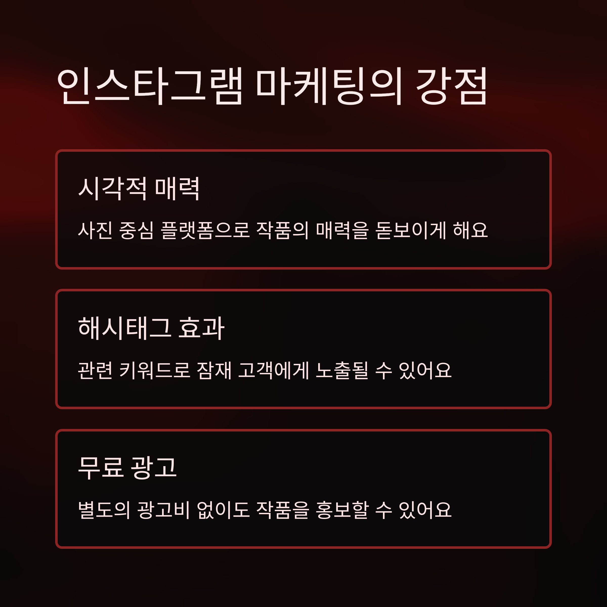 그렇기 때문에 누구나 쉽게 시도할 수 있는 장점이 있죠. 특히 Instagram은 자연스럽게 내 작품을 홍보할 수 있는 공간이기 때문에, 글만 작성하고 사진만 올리면 된다는 점이 정말 매력적이었습니다.