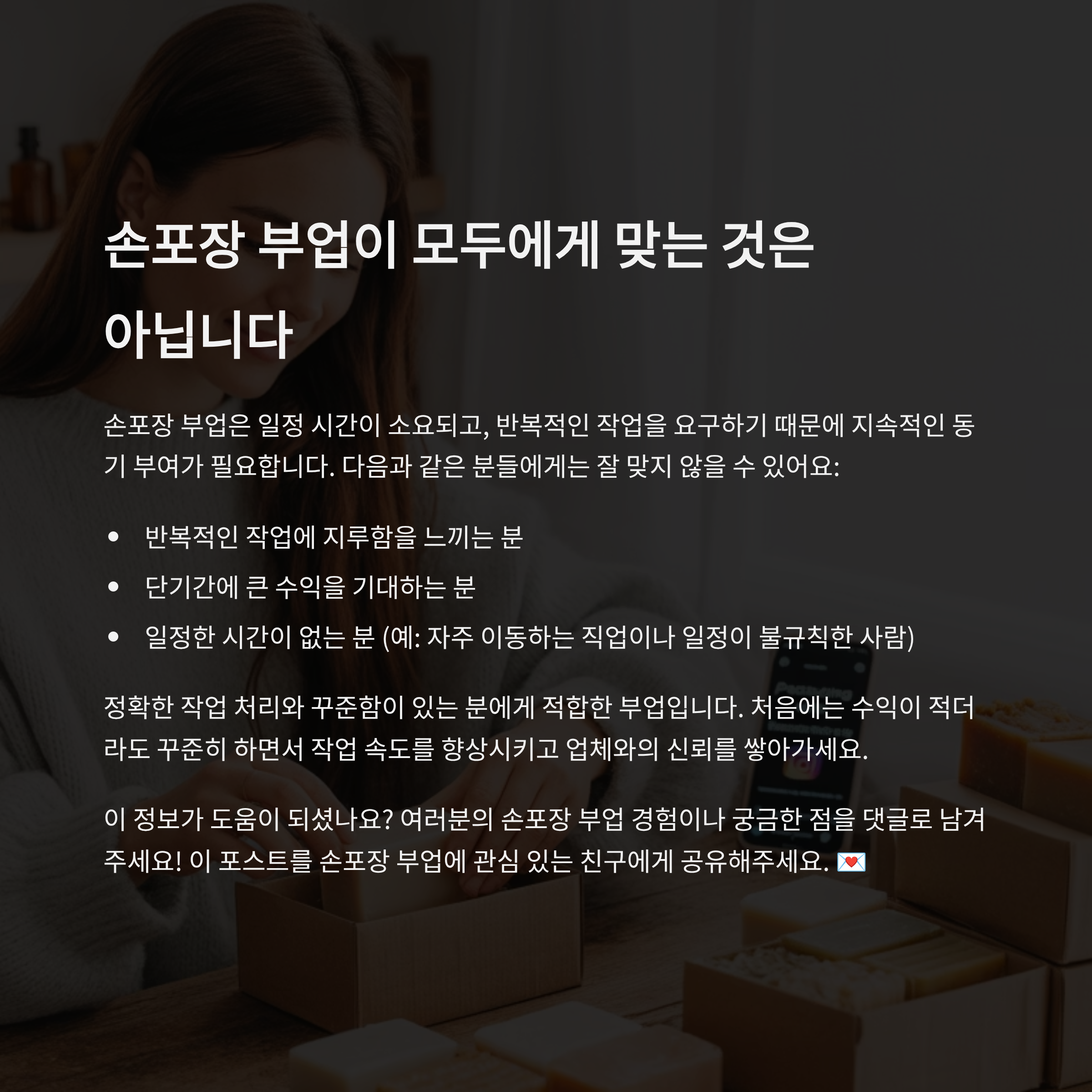 손포장 부업은 누구에게나 적합한 부업은 아닙니다. 이 부업은 일정 시간이 소요되고, 반복적인 작업을 요구하기 때문에 지속적인 동기 부여가 필요한 작업이에요. 그래서 인내심이 부족한 분이나 변화를 선호하는 분들에게는 잘 맞지 않을 수 있습니다.
