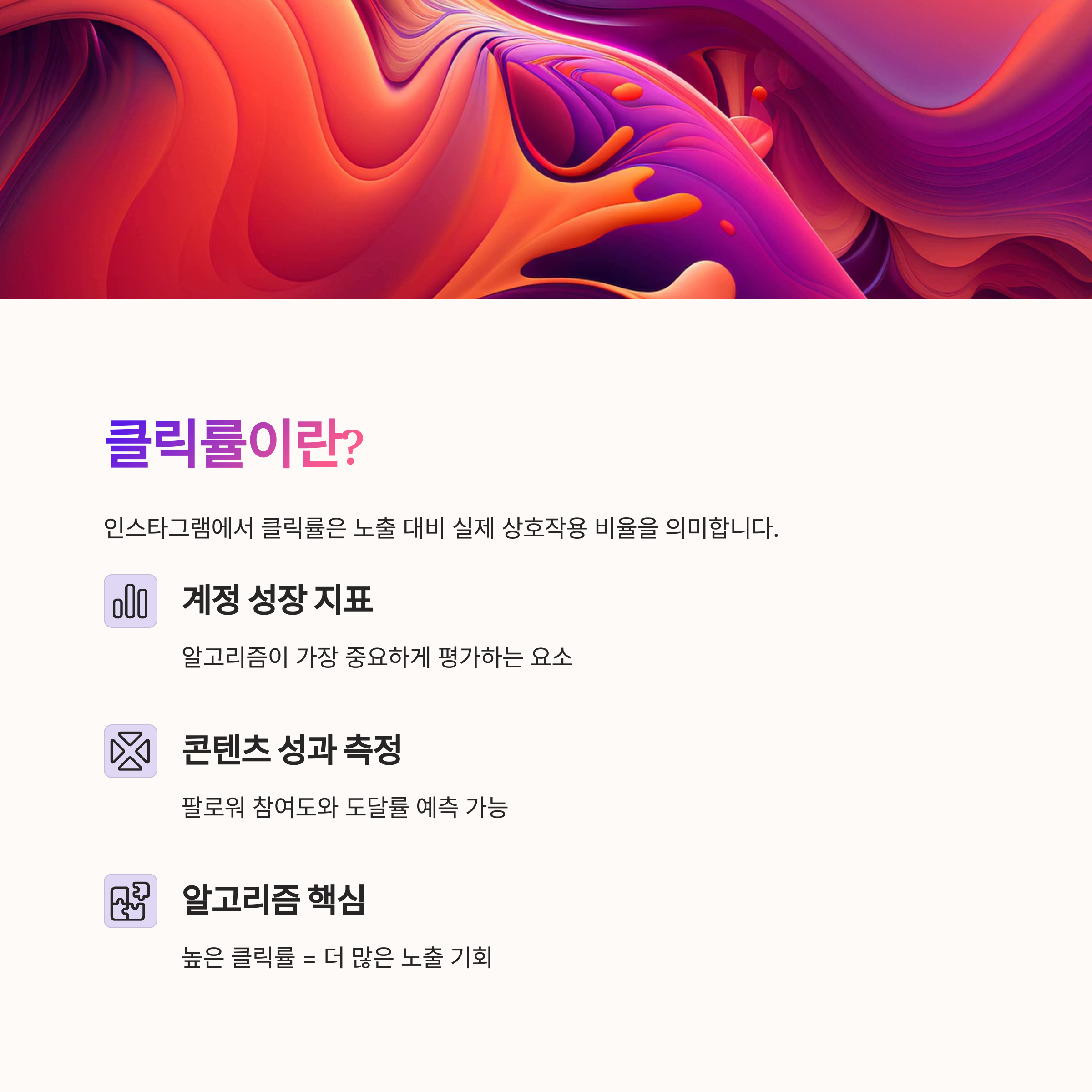 인스타그램에서 클릭률(CTR)은 여러분의 포스팅이나 스토리, 프로필, 광고 등에 포함된 링크나 행동 유도 버튼이 얼마나 효과적으로 클릭되었는지를 나타내는 비율이에요. 즉, 단순히 노출이 아니라 실제 행동으로 이어지는 비율이죠. 수많은 포스트가 스크롤되는 피드 속에서 사용자의 클릭을 유도하려면 단순히 ‘예쁜 이미지’ 이상이 필요합니다. 요즘 인스타는 단순 뷰 수보다 행동 기반 데이터를 더 중요하게 취급하죠. 클릭률은 제휴 마케팅, 제품 판매, 이벤트 홍보 등에서 가장 핵심 지표가 되며, 이 수치를 높이는 것이 곧 수익으로 이어지게 됩니다.
