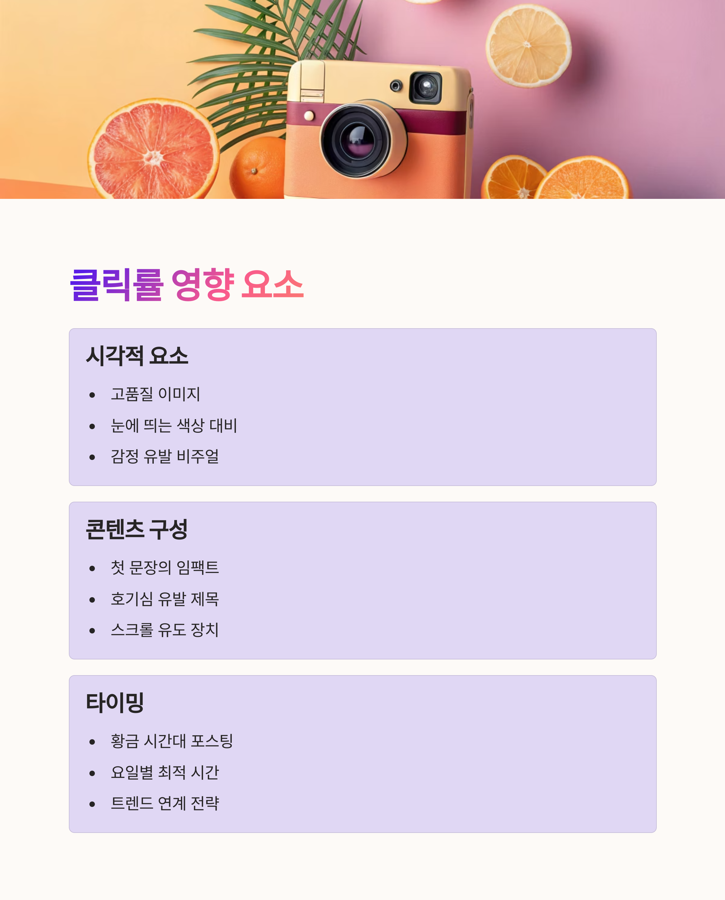 인스타그램에서 클릭률을 결정짓는 요인은 생각보다 다양합니다. 단순히 ‘링크 넣기’ 수준이 아니죠. 아래 표는 실제로 클릭률 상승에 영향을 준 주요 요소를 정리한 것입니다.