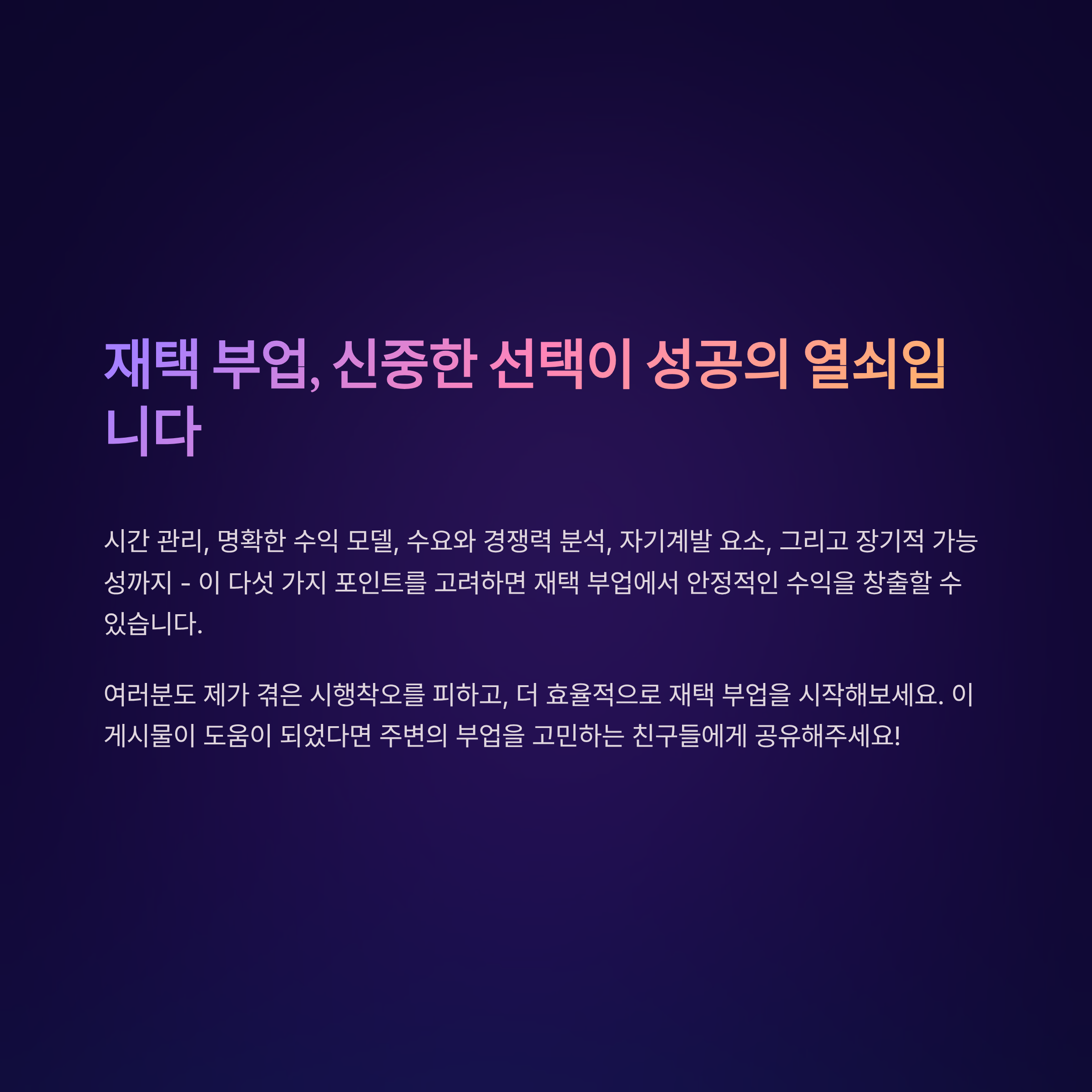 재택 부업을 선택할 때는 단기적인 수익뿐만 아니라 장기적인 가능성도 중요합니다. 저는 여러 번 단기 수익을 올릴 수 있는 부업에 집중했지만, 결국 지속적인 수익을 위해서는 장기적인 성장 가능성이 있는 아이템을 선택하는 것이 더 효과적이라는 것을 알게 되었습니다.