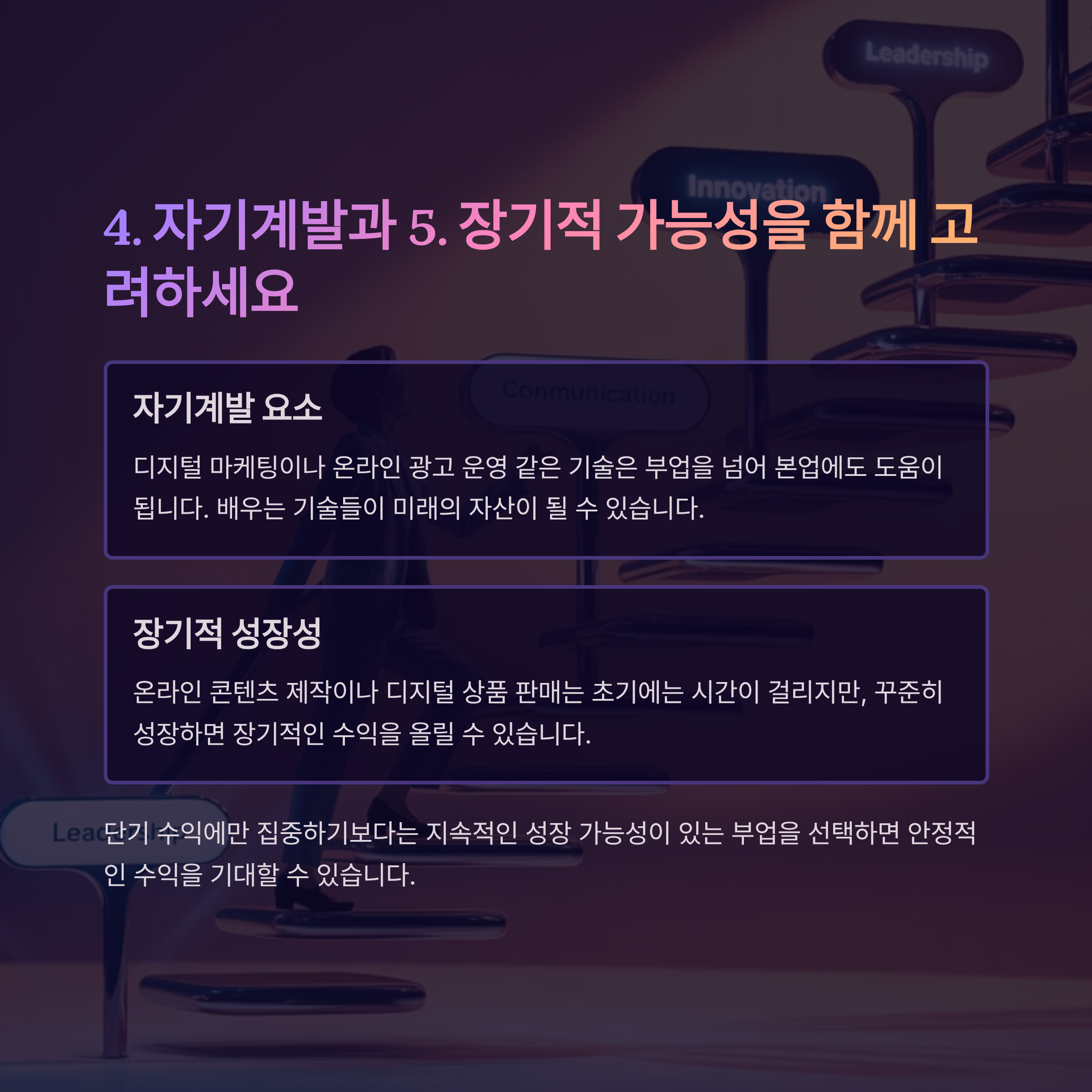 예를 들어, 온라인 콘텐츠 제작이나 디지털 상품 판매는 초기에는 시간이 걸리지만, 꾸준히 성장하면 장기적인 수익을 올릴 수 있습니다. 꾸준히 자기계발을 통해 성장할 수 있는 부업을 선택하면, 장기적인 안정적인 수익을 기대할 수 있다는 점을 항상 염두에 두고 시작해야 합니다.